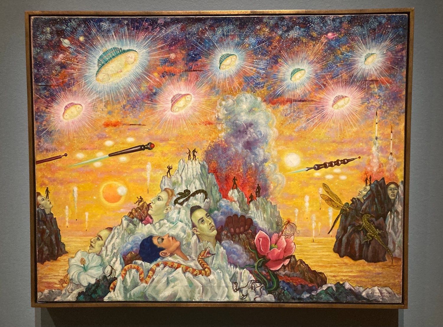 Macena Barton, "Untitled (Flying Saucers with Snakes)" (1961), oil on canvas, M. Christine Schwartz Collection