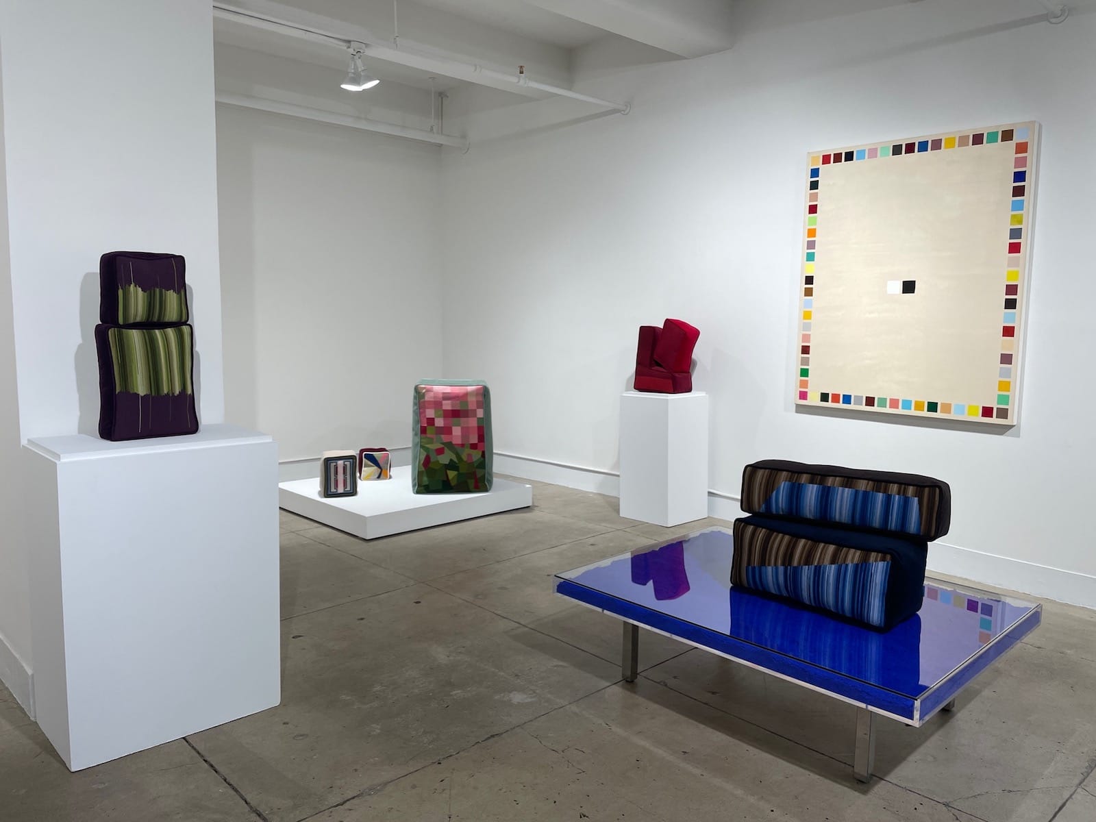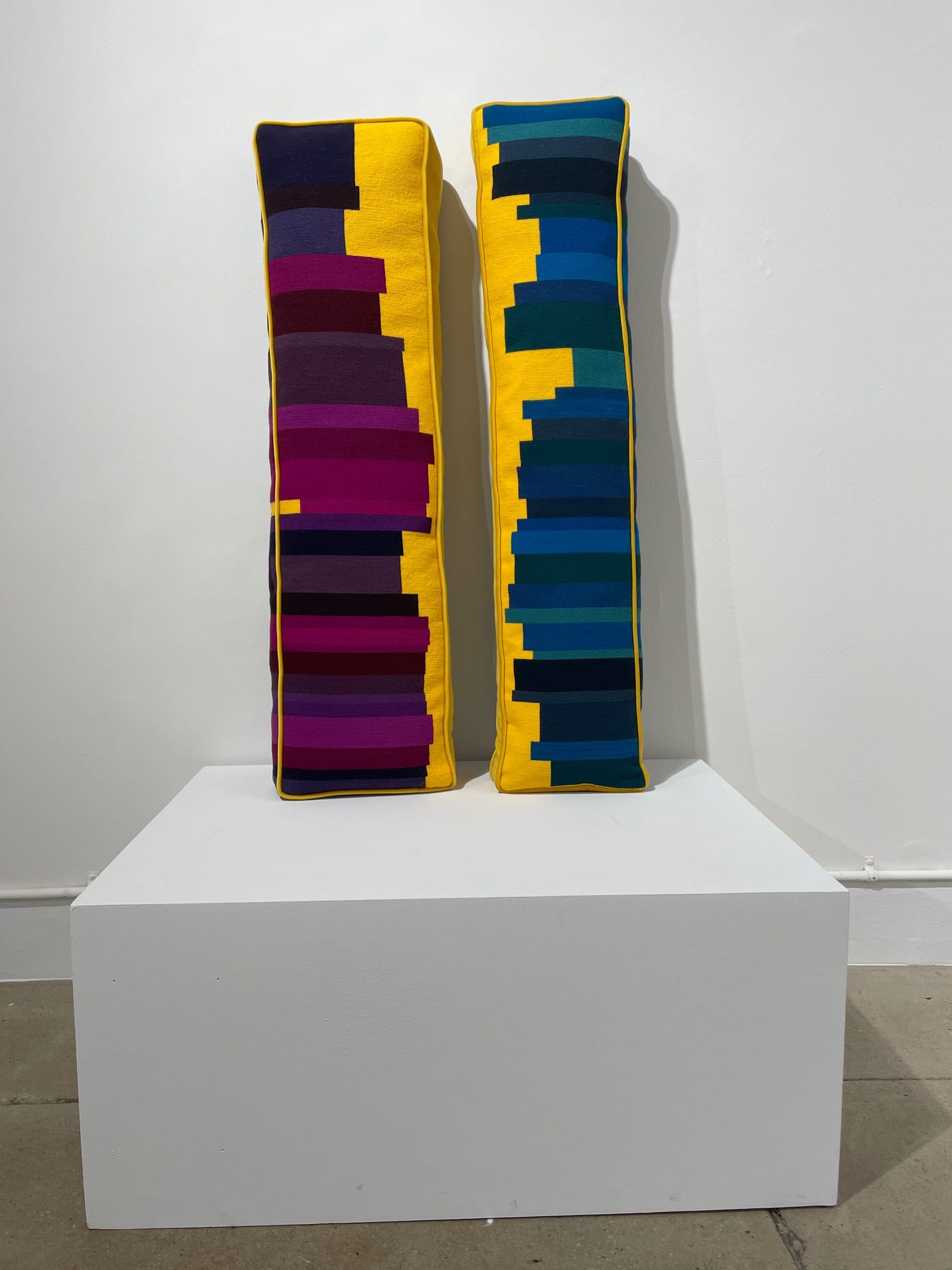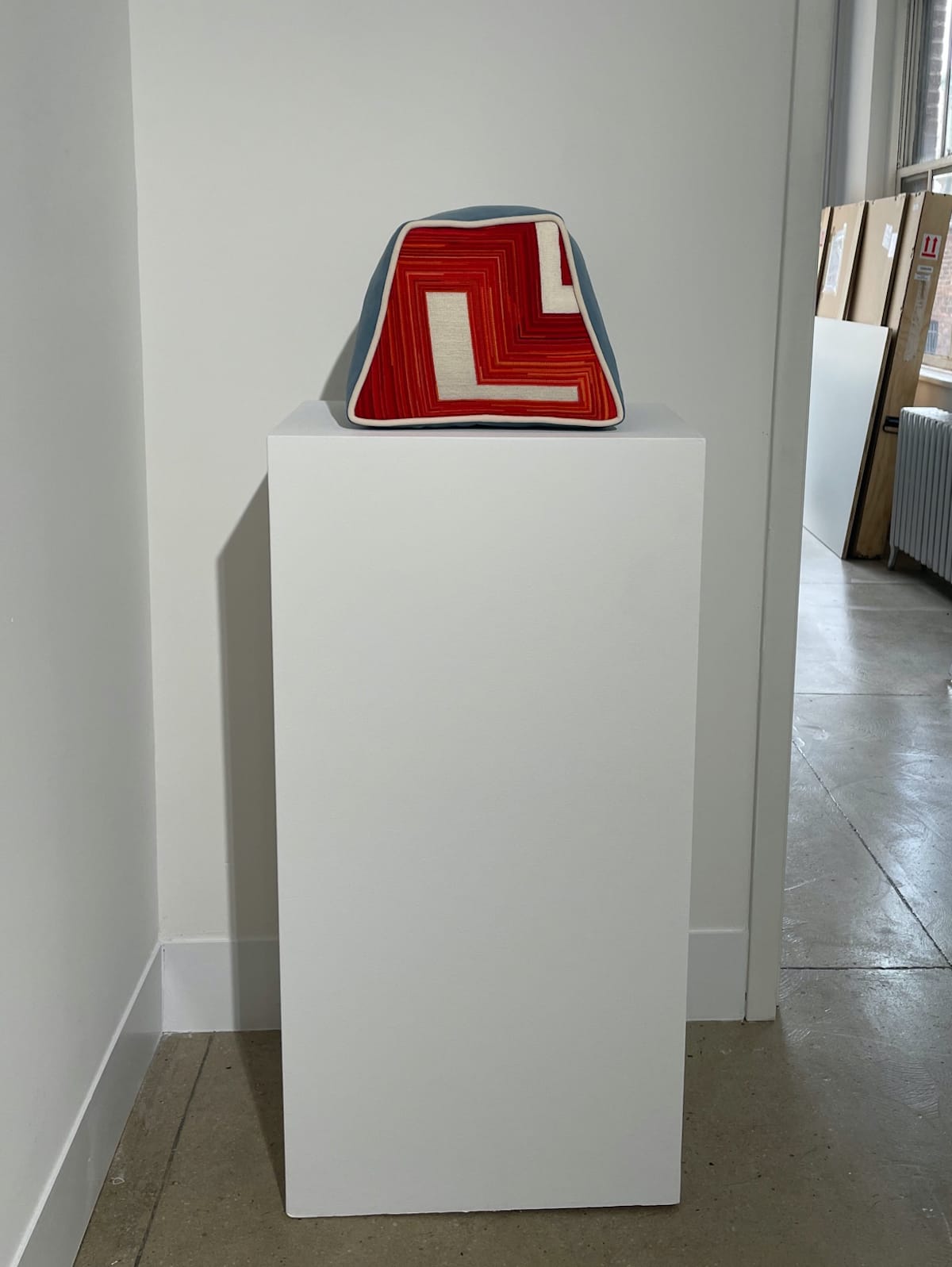 The gallery’s bright, studio-sized viewing room below Canal Street, appointed with two modern chairs, painted or upholstered in white, and an Yves Klein-designed table in iconic International Klein Blue, had the becalming hush of a private living room the afternoon I visited. As it turns out, the chair tucked in the corner nestles Kaufman’s “2 Triangles With Green Scales” (2020), two stacked, patterned, cushiony triangles made of wool on needlepoint canvas, velvet, cotton, or synthetic stuffing. One glance at this enticing arrangement — and a similar “cushion”-chair combo by the window on a Mies van der Rohe Barcelona chair — confirms that Kaufman knows how to coax humor, and joy, from art movements ostensibly too analytical for this purpose. Even with reduced palettes and spare compositions that evoke constructivism, her sculptures can go from orderly to helter-skelter, making them seem like willful renegades from an industrial assembly line.