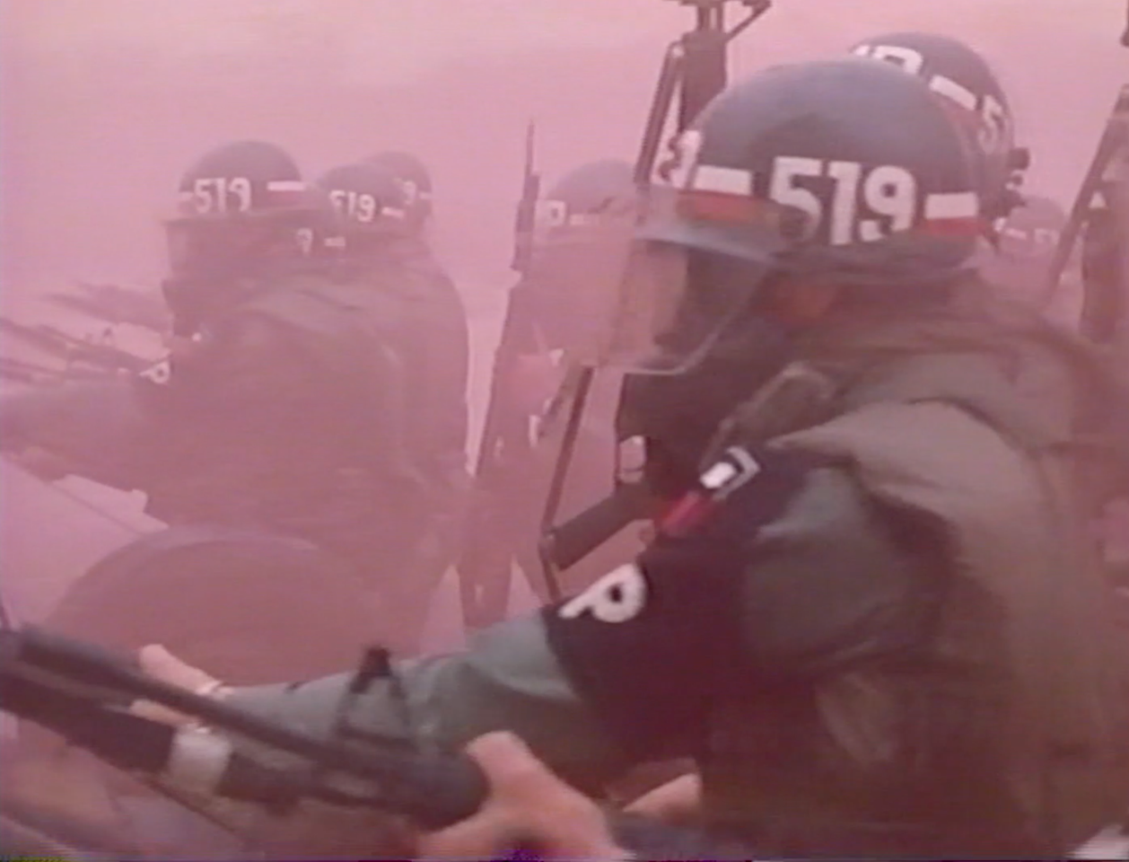 SP: I'd still love to make something from this. There was a Colonel Turner, one of the top brass of the program, who I read about in Stuart Schrader's book. During the Chicago riots, he seized weapons from protestors and gun stores, and said he was doing so to use them in Riotsville. Instead he either put them in his personal collection or sold them for profit, and he became part of this big corruption trial. I kind of loved and despised the disgusting cynicism of that; it's something you see in the Riotsville exercises, where the military is taking guns out of stores and throwing them in their tanks, trying to clear the area of weapons. There's some footage of him from that trial. But there wasn't enough to make it work. Another official went on a press tour where he was trying to claim that mace doesn't bother anyone. He was spraying himself in the face on television. It's endless, the depravity of policing in America. That was the problem when making this film. Everything is so fucked up, so if you go too far down even one path, you could get lost.