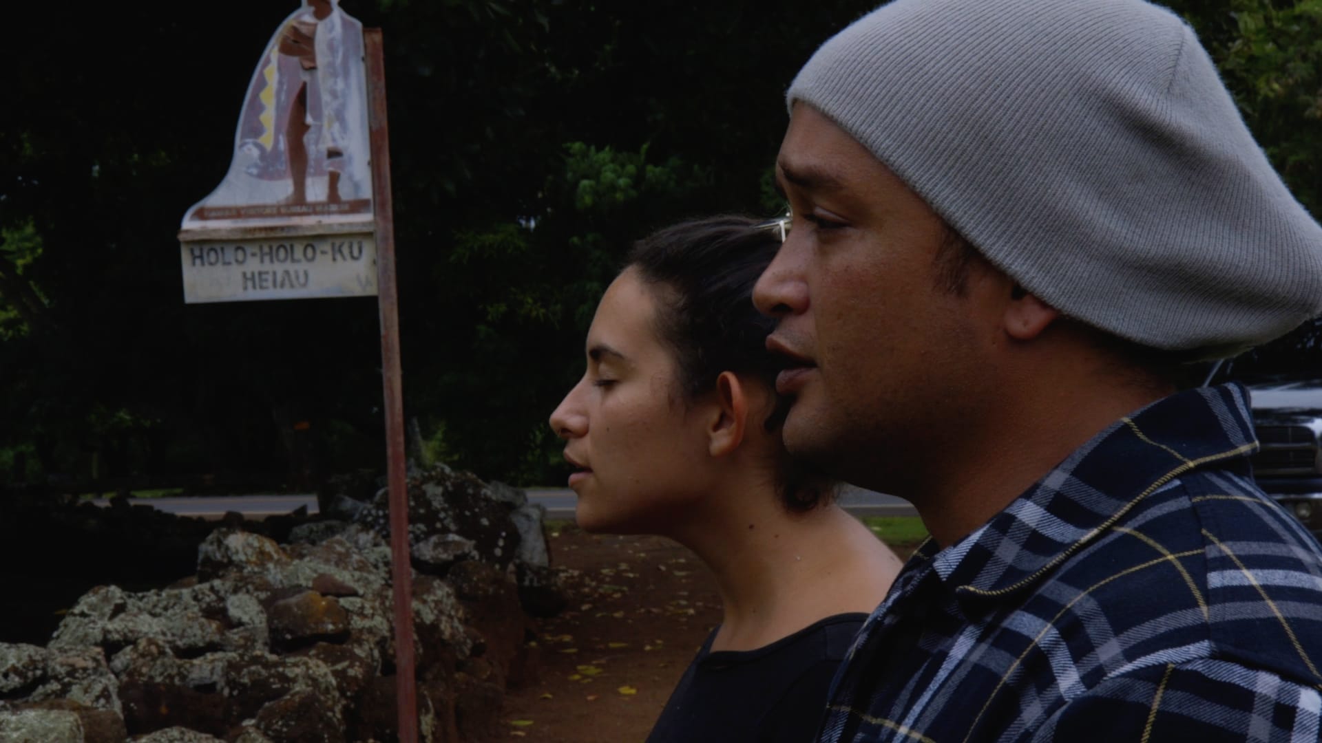 Banua-Simon shoots in an intuitive and present manner, rather than with carefully staged camerawork. He only indulges in symmetry and landscape when composing the stunning view from his Great Uncle Henry’s secret spot in the hills. This aesthetic humility sets Cane Fire far apart from the Hollywood pictures, travel agency ads, and vlogs that endlessly vulgarize Kauaʻi’s beauty. The archival materials are edited to emphasize Native and Asian Hawaiian extras (often cast interchangeably in subservient, non-speaking roles). Brought to the foreground, these actors' thousand-yard stares pulverize the illusions of the films around them. Banua-Simon intercuts them with contemporary portraits of Kauaʻi residents, illuminating the limits of the Hollywood frame and imagination with his own vibrant formal play.