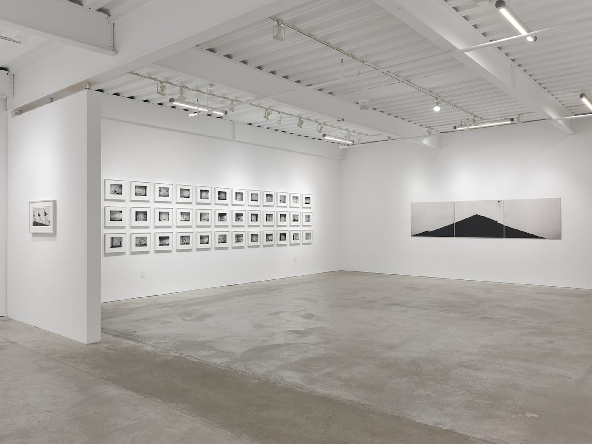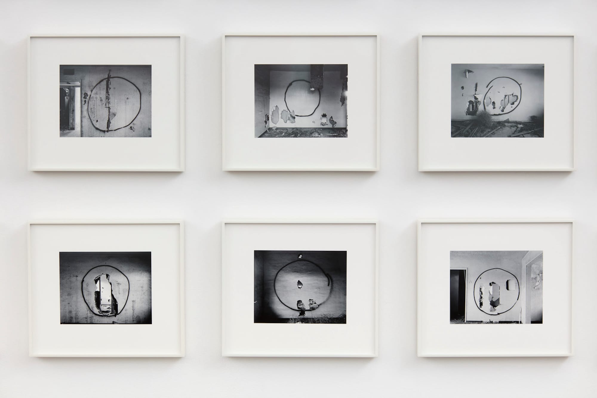 The centerpiece of the exhibition is John Divola’s “ENSO: 36 Right-handed Gestures” (2018), a grid of 36 gelatin prints of pictures made in the abandoned housing tract at an Air Force base in Southern California. Divola has altered the deteriorating space by painting circles on the walls around specific details within each picture frame (stains, bullet holes, water damage). By highlighting elements of the ruin, Divola reveals particularly how photographs preserve.