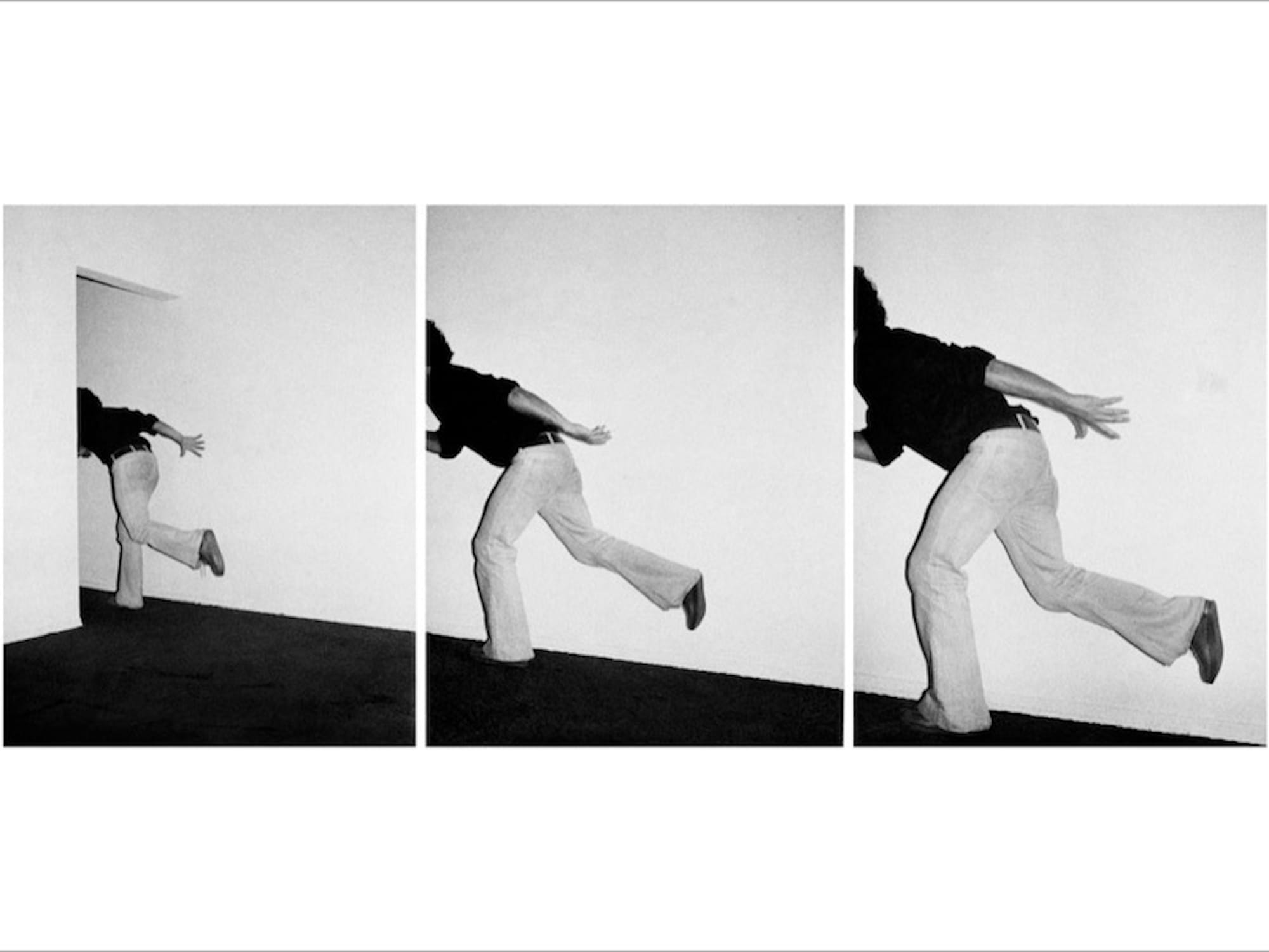 Steve Kahn, who also shot in dilapidated interiors — notably one apartment complex in Los Angeles throughout the mid-70s — approached the subject of photographic entrapment differently, staging spaces which often appear inescapable. “Running” (1976/2016) is a cinematic, triptych pigment print, in which a figure is seen dashing toward a doorway, appearing to move forward in each frame. Clever cropping gives the piece its heightened sense of motion, the figure’s front end cut off by the edges in two pictures and then by the doorway in the third. It becomes hard not to see each frame as a doorway in and of itself to be entered or escaped, each picture a moment of time held hostage.