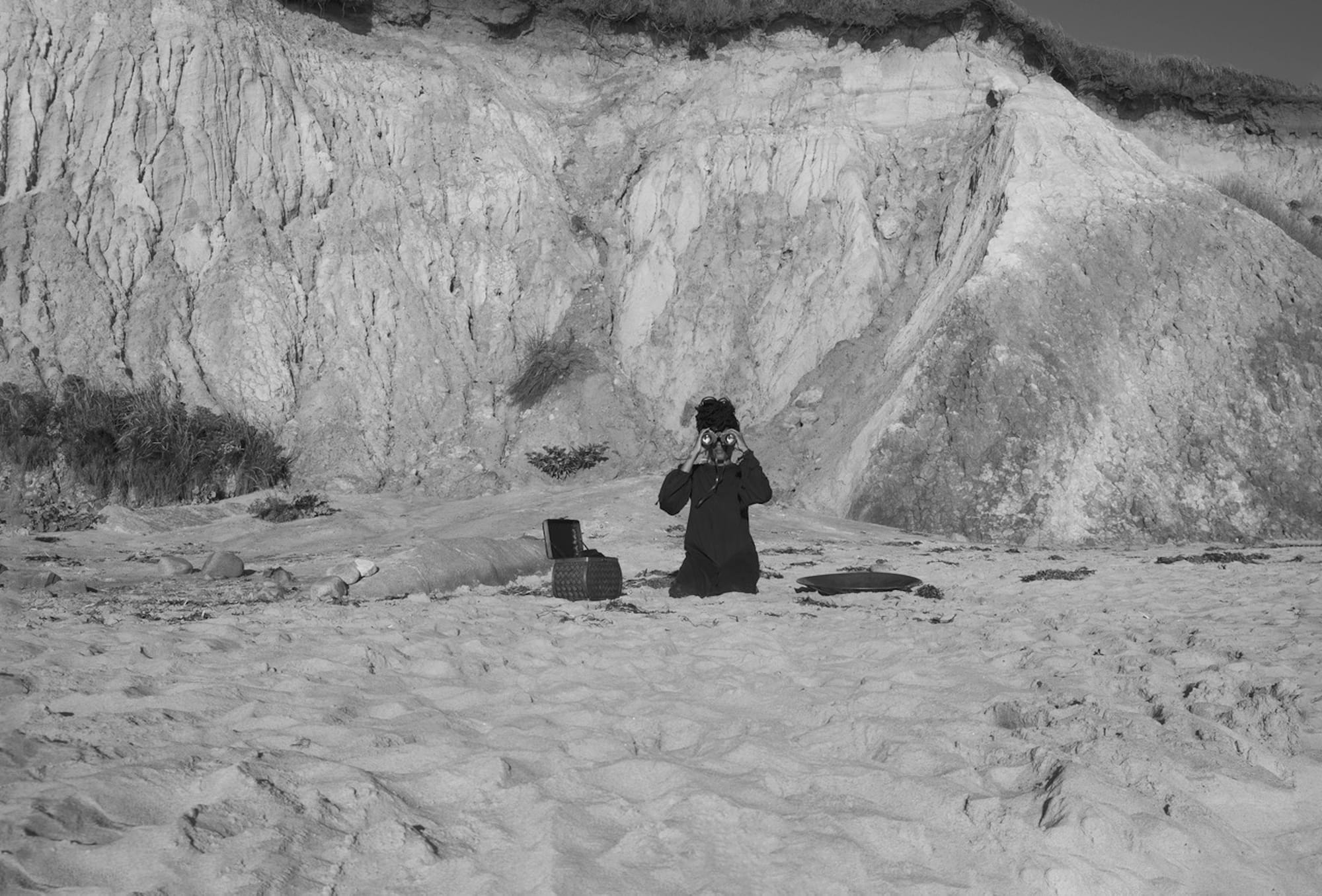 Tarah Douglas’s series of pigment prints, Untitled (no 1-15) (2020), alternates frames between two figures — one roaming a hilly landscape in search of something, the other kneeling on a beach, performing what looks like a series of rituals with various objects, such as flowers, a book, and a pair of binoculars aimed back at the viewer. Here, Douglas reveals how photography, too, is a ritual of searching, a record of looking for and at something, a collection of moments made with a wide-cast net.