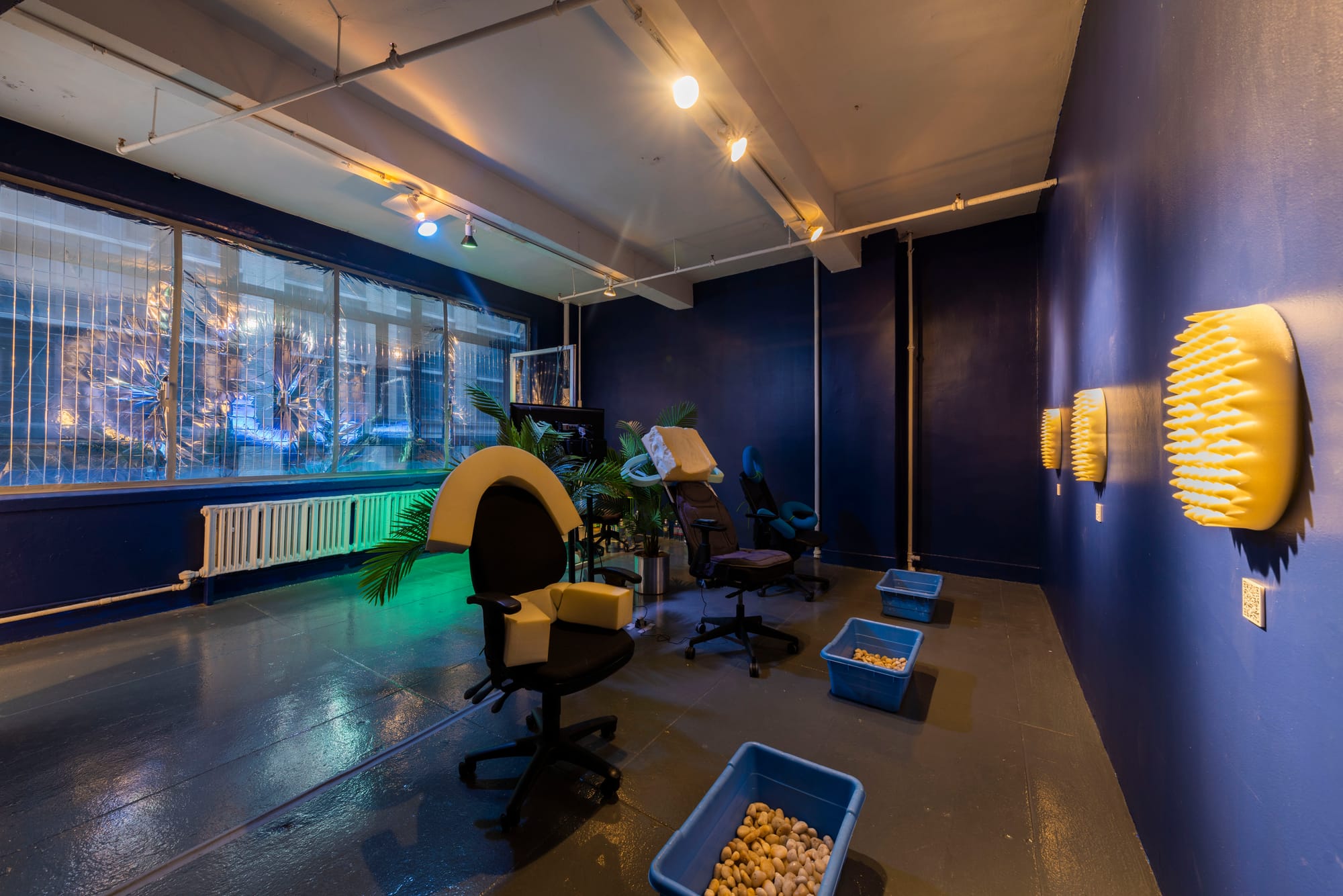 The performance I attended, Anna Rose Hopkins’s Acts of Service, a nonprofessional spa whose treatment menu options (such as “Weigh Me Down” and “Forgive Me”) corresponded to different ocean depths (the Abyssopelagic and Hadalpelagic zones, respectively), knocked me off balance in a good way. When I arrived at the gallery, Hopkins was lying down, eyes closed, on one of Slowing Time’s padded benches, clad in a navy blue bodysuit, black boots, and seashell press-on nails — a kind of steampunk Oceanic art spa technician’s costume. She asked if I first wanted to listen to Languish at the End of the Ocean’s audio, then set me up in one of the jerry-rigged spa chairs. The lushly written second-person audio guides the listener through a 30-minute-long fictional narrative in which you morph into various aspects of an aquatic environment, blurring the boundaries between self and others.