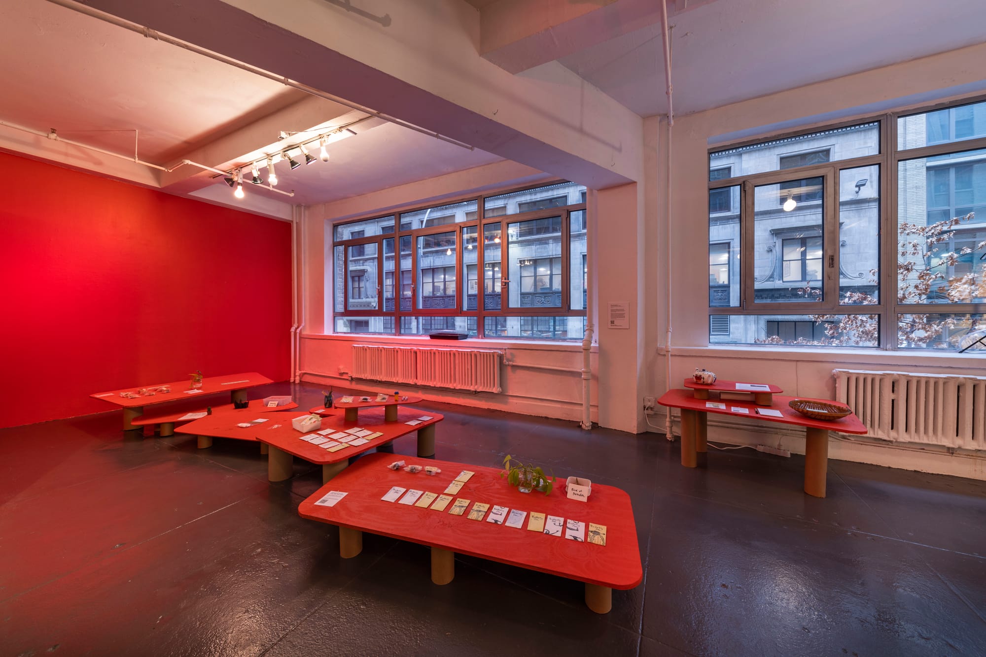 An overhead camera remains fixed on several asymmetrical, reddish tables. Atop the jaunty tables rest orderly groupings of items — a grid of plastic baggies; a line of paper packets — whose details aren’t discernible from this camera vantage. The uneventful scene is live streamed on Twitch as part of Sprout Hinge Nap Wobble, a group exhibition at EFA Project Space curated by Dylan Gauthier, Radhika Subramaniam, and Marina Zurkow. The deadpan, Warholian stream is the opposite of the action-packed video gaming content for which the Twitch website is known. This anti-sensational bent is in keeping with the ethos of the larger exhibition and of the broadcast work, Take, Leave, Knoll* … *the act of arranging a group of objects parallel or perpendicular to each other (2003-ongoing), a plant swap organized by Eating in Public, a longtime collaboration between artist Gaye Chan and scholar Nandita Sharma dedicated to creating cultural space for anticapitalist free exchange.