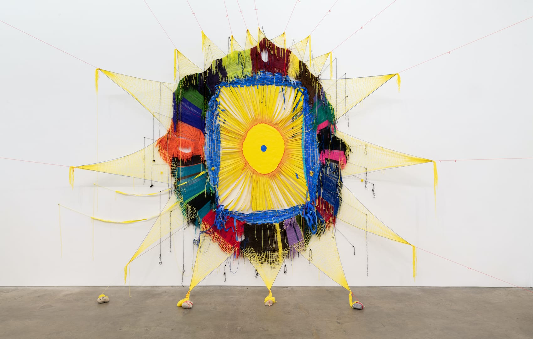 Made of canvas, acrylic polymer, acrylic ink, yarn, thread, wire, and dried lotus root, “Red Sun” (2021) is an eye-like structure composed of red lines radiating from a central red disc to a surrounding double-circumference band of yarn stretched between two rigid, linear structures. The suspension of the disc (or star) within a frame is a form that Segre explores in the exhibition’s three large sculptures, two mounted on the wall and one freestanding. In the wall-mounted “I Talk to the Trees” (2021), I read the blue circle in the middle of the bright yellow egg-like disc, rimmed in red, as a pupil. The yellow eye is suspended by strips of yellow cloth within a woven blue frame-like structure, but as I have come to expect Segre does not stop there. Two more sections extend out from the blue frame: a series of rectangular bands, each a different color of yarn, and netted triangles extending from the yarn rectangles.