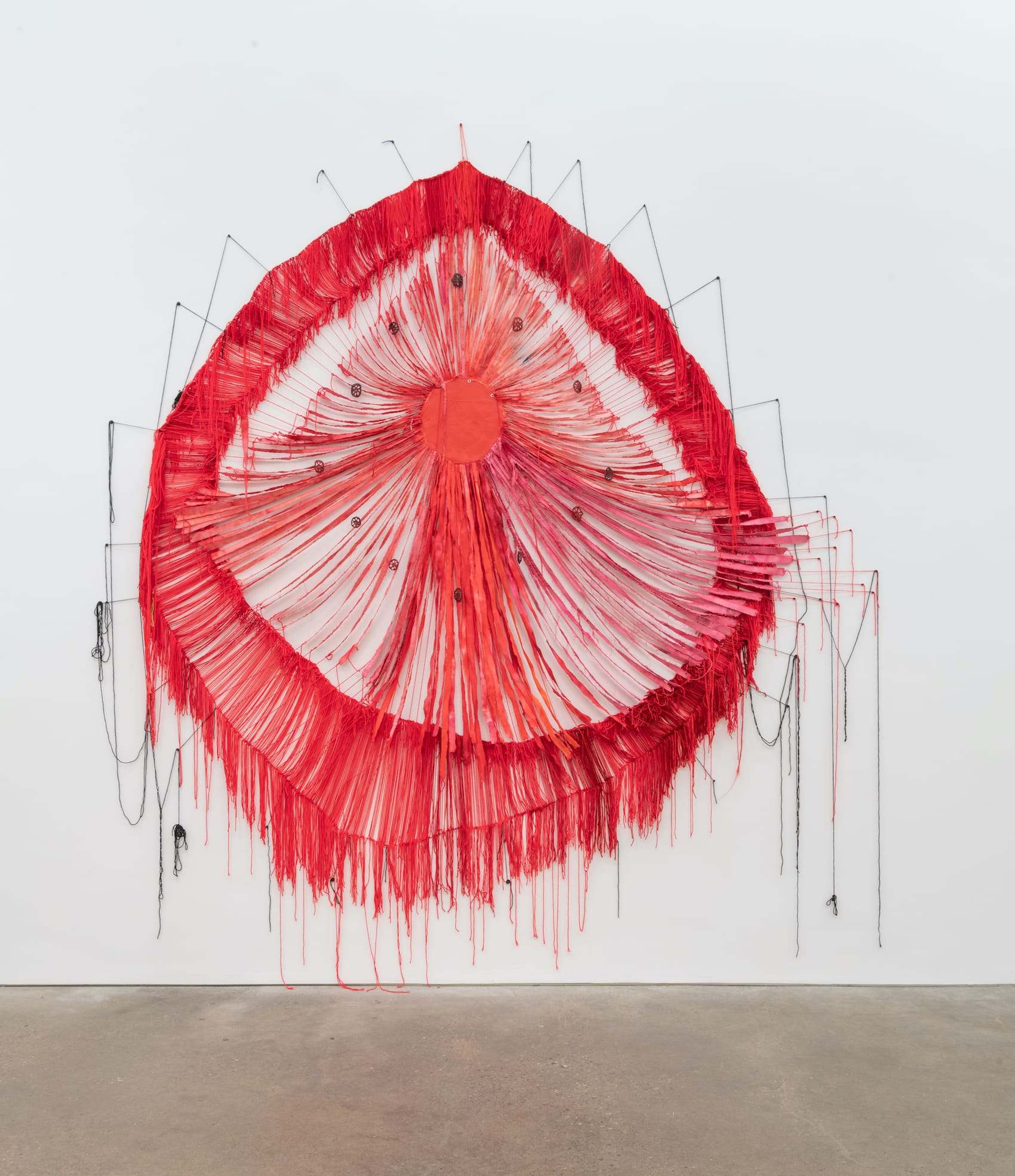 Although nothing explicitly connects them, it seems to me that Segre and Robert Smithson share something in their view of impermanence and time. However, whereas Smithson focused much of his attention on geological time and entropy, Segre mushrooms to stars and eyes, from small bodies to massive ones, the eye to shamanic projection and traveling via dream and hallucination. She celebrates altered ways of seeing, and of being, in the world. Whose eye is she framing in “I Talk to the Trees”? Is her sun red because of pollution and smoke in the environment? What does it mean to make a structural sculpture out of yarn, threads, and strips of cloth? Doesn’t Segre’s brilliant replacement of the patriarchal aesthetics of masculine permanence subvert an oppressive legacy?