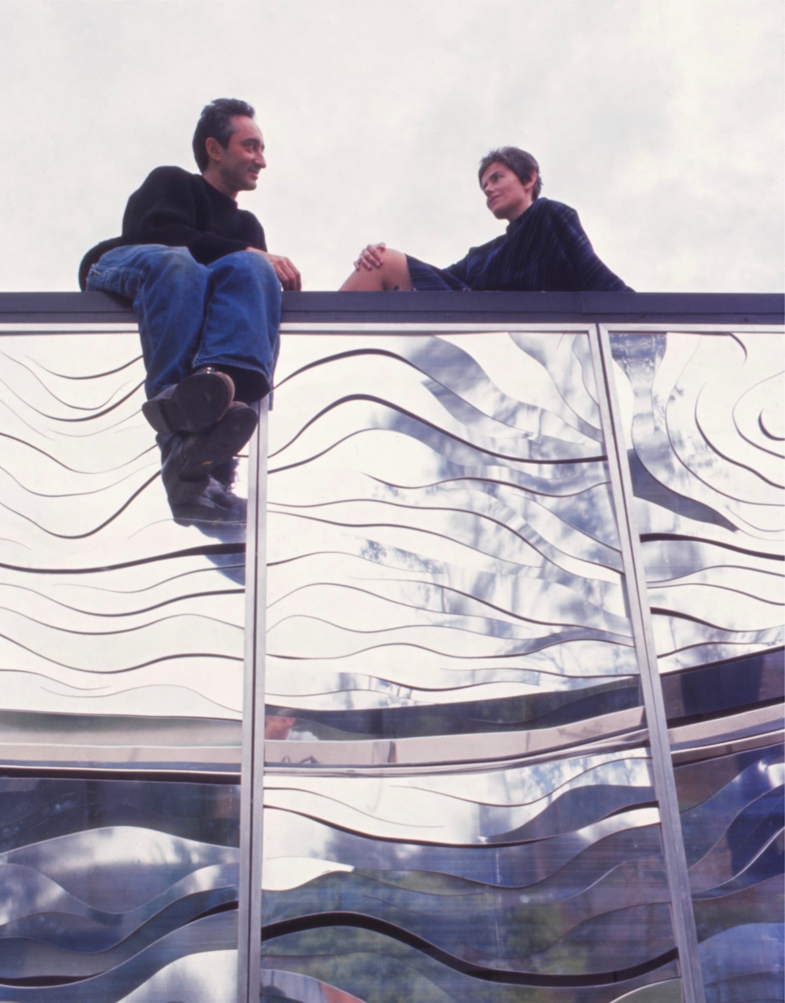 Peter and Irene sit above the anodized aluminum screen panels of Peter’s "Relief Sculpture V," a nearly nine-foot sculpture commissioned by Alcoa for their Chicago office, 1968 (photo by Richard Gross)