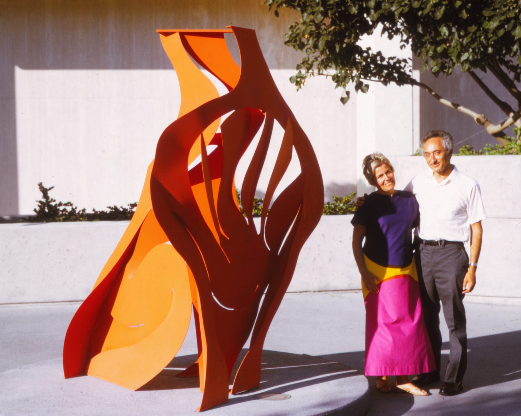 Irene and Peter with Peter’s sculpture in front of the GTE building, Santa Monica, California, 1973 (photo courtesy the estate of Irene and Peter Stern)