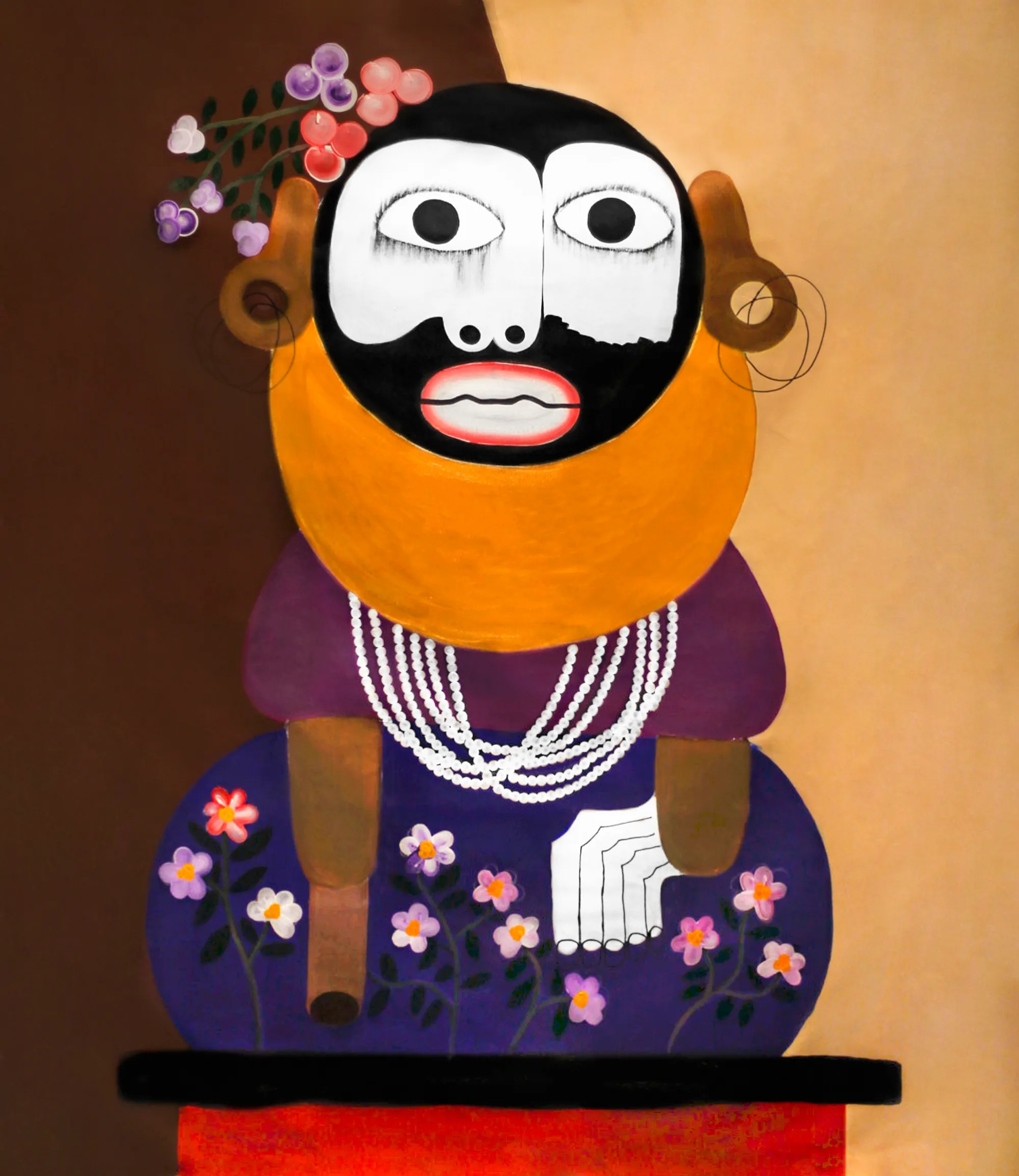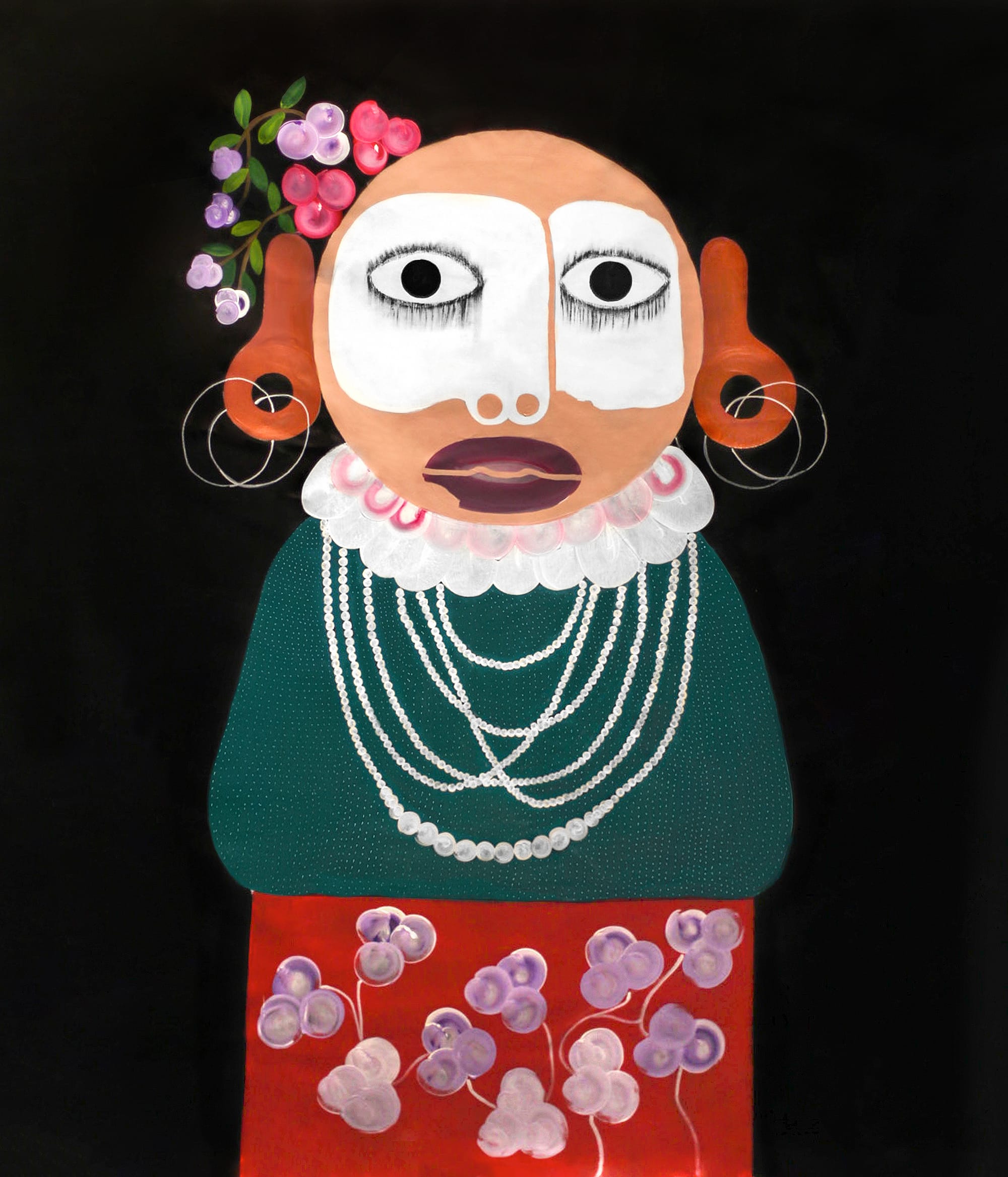 These figures’ dissociative gazes provide viewers interpretative space. More at ease than others on display, the person in “Keeper #1” (2022), posed in front of a subdued brown and beige backdrop, seems to register resignation. A honey-brown collar unnaturally stiffens the figure, suggesting discomfort despite the regal blue and purple clothing. Strands of pearls drape from the collar. Whimsical flowers around the skirt and head don’t liven the austere mood. The figure’s expressionless black eyes inspire contemplation. The characters function as totems, carrying the viewer into an introspective, spiritual realm. There he must contend with those things that have become a fact of life regardless of choice.