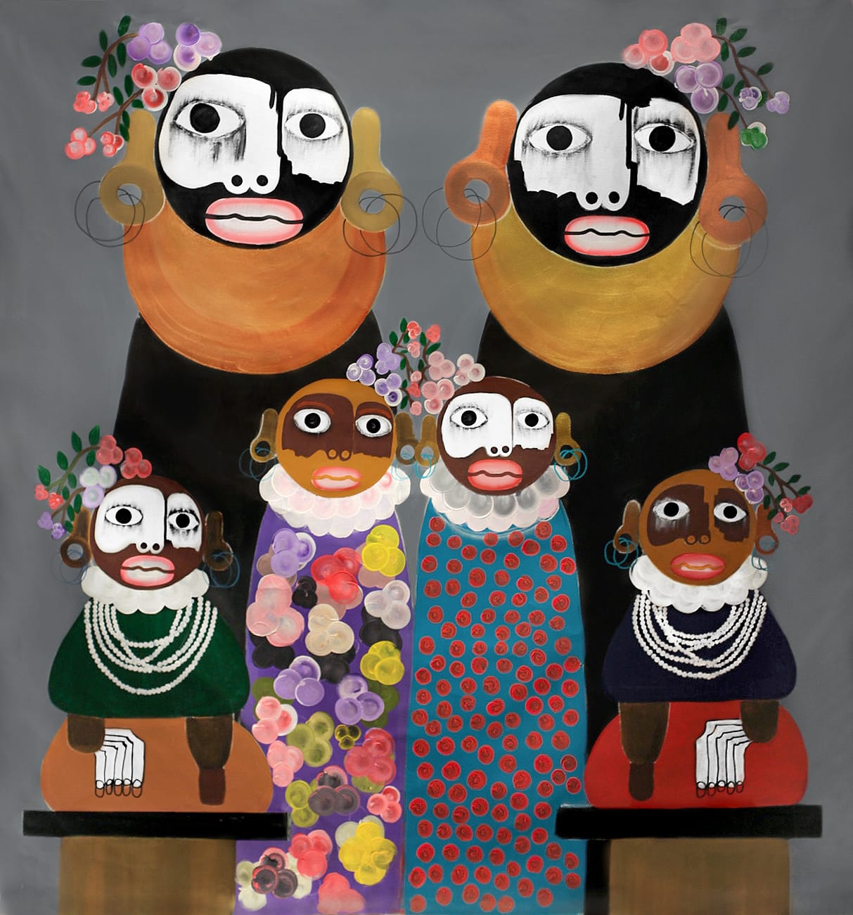 A flat, gray backdrop sets a dreary mood for the family portrait “Gatekeepers” (2022). Two parental figures wearing nearly identical black robes and tan collars anchor the painting. Their mask-like faces are both black and white, and would look neutral if not for the smudging around the eyes, which suggests bruising or running mascara. In the foreground two children wear bright, flowered robes and white collars—one’s face is the color of peanut butter with a darker brown around the eyes, and the other’s is a mix of dark brown and white. Flanking them are two more child-like characters, perhaps younger. Pearls hang from their white-collared necks. If the parents’ smudged eyes hardly disturb their neutrality, their children’s shock and despair appears all too evident. Their relative size dramatizes any emotions projected onto the canvas. In Marfo’s execution, the family portrait, a bourgeois symbol of prosperity and stability, simmers with tensions.