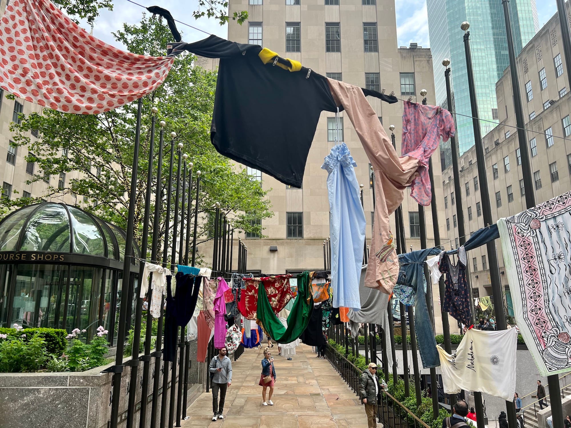 Most New Yorkers aren’t fazed by much. But when Brian Thoreen told a group of locals that he and a crew of construction folks were hoisting and foisting with forklifts smack in the center of Rockefeller Center, they gasped. On Tuesday, May 10, the artist and design dealer stayed up until 4am hanging the clothes lines of Pia Camil’s new work “Saca Tus Trapos Al Sol (Air Out Your Dirty Laundry)” on the 193 flagpoles surrounding the Rink (you know, where Jeff Koons and Kaws oversized statutes often loom).