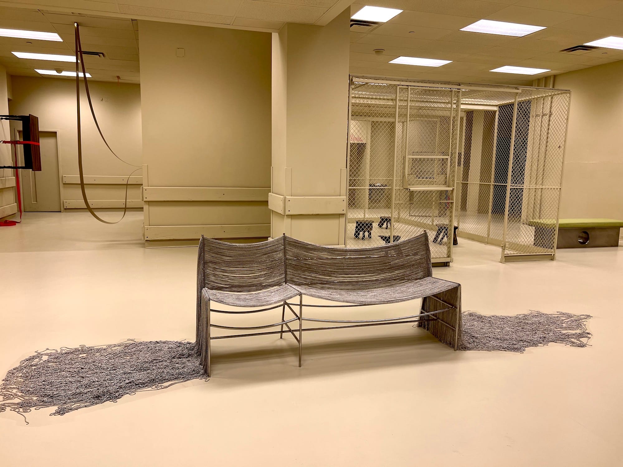 Camil’s site-specific intervention is a brazen public-facing commentary that strings together over 700 items of used clothing, collected by Camil from donations in Mexico City and still soaked in the humanness of their previous owners. It’s part of a show called Intervención/Intersección, the latest venture from MASA Galería, up through June 24. Co-founded in Mexico City in 2018 by Thoreen, Age Salajõe, and Héctor Esrawe, the roving design platform seeks unconventional ways to showcase and dialogue the urgencies of material culture. Past projects include shows in an Oaxacan medical clinic, a crumbling Mexico City manse, and an empty skyscraper in the city’s Roma district. Now, MASA has come to New York — in RockCenter, of all places — which may not sound particularly notable, except in this case, it really quite is.