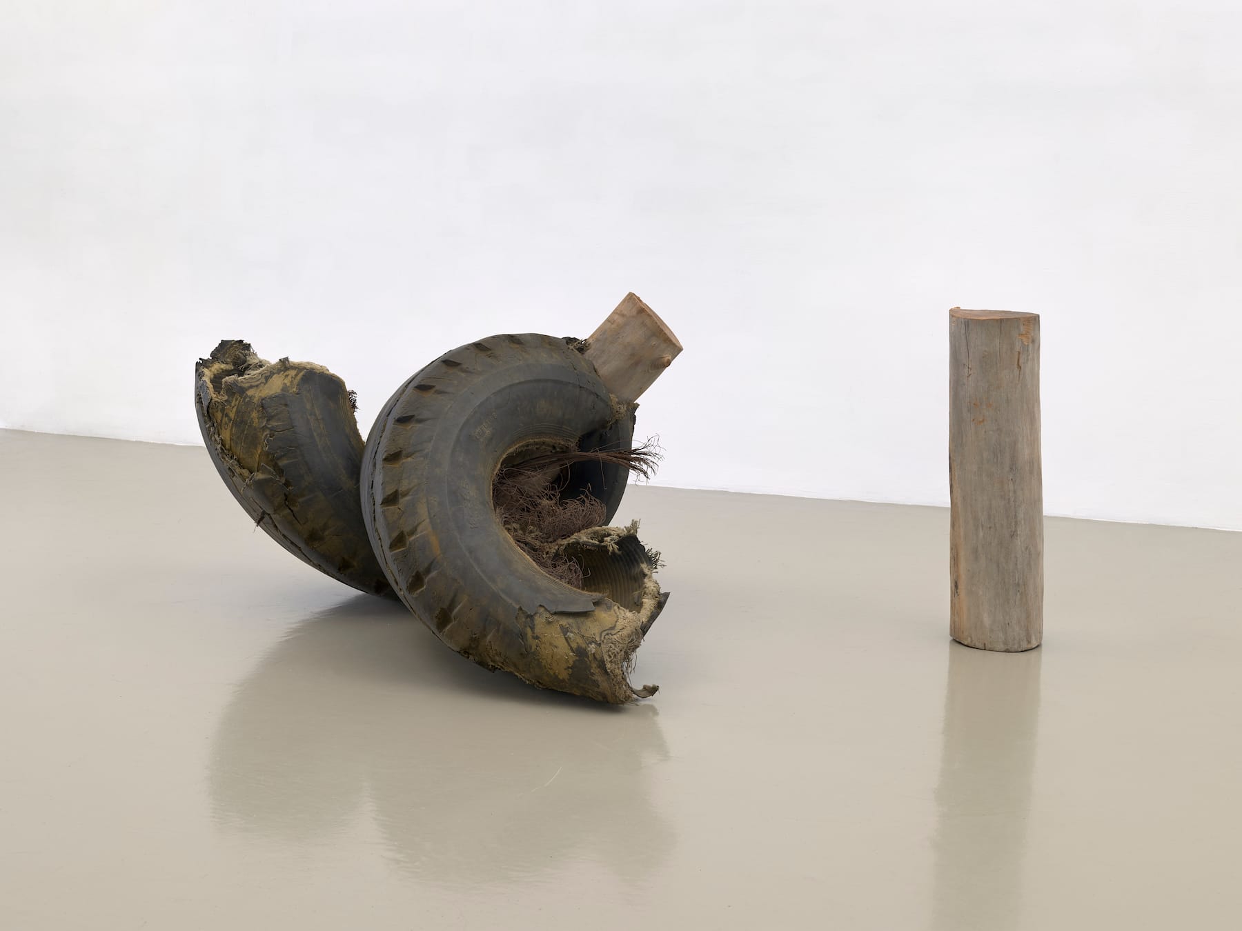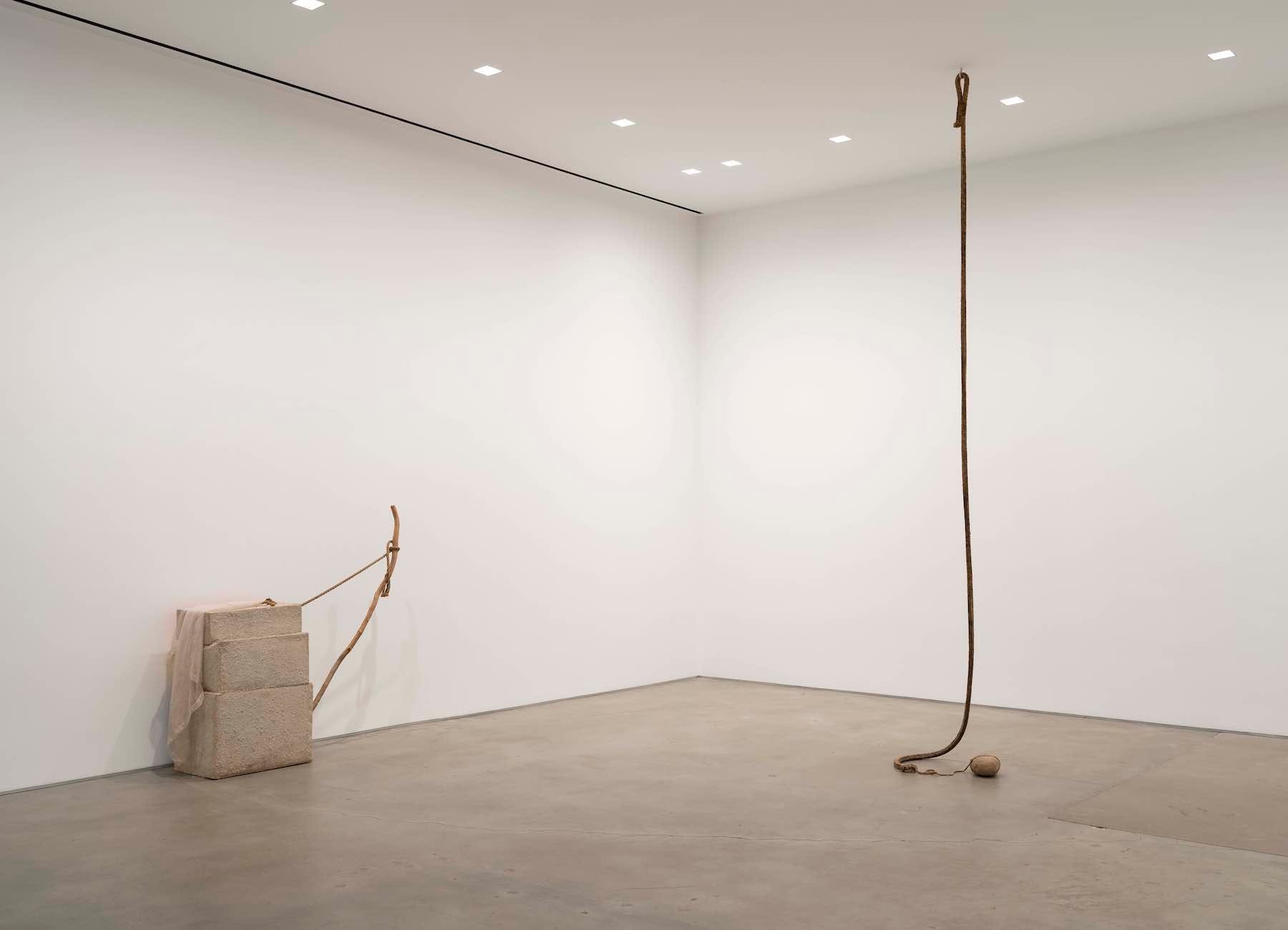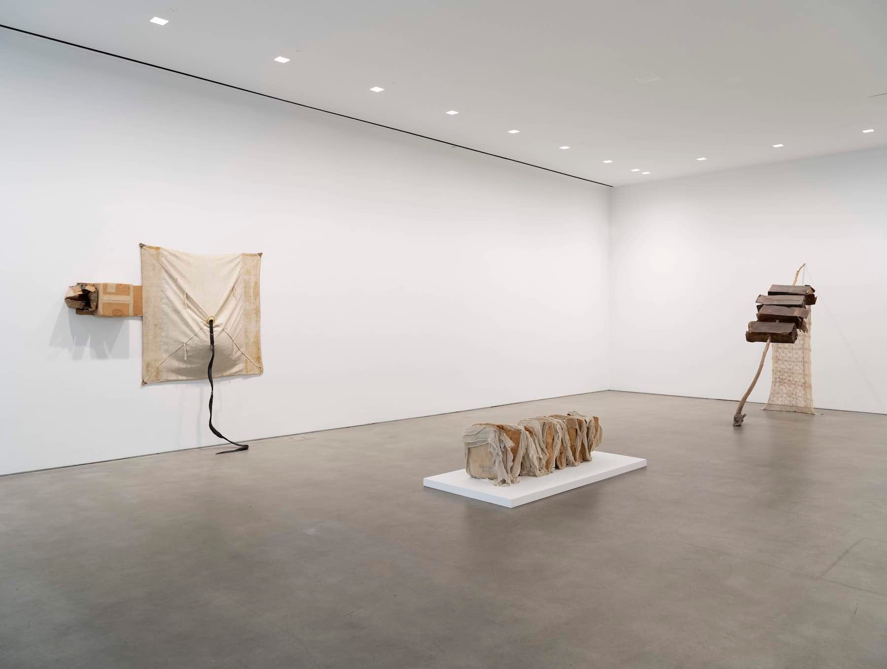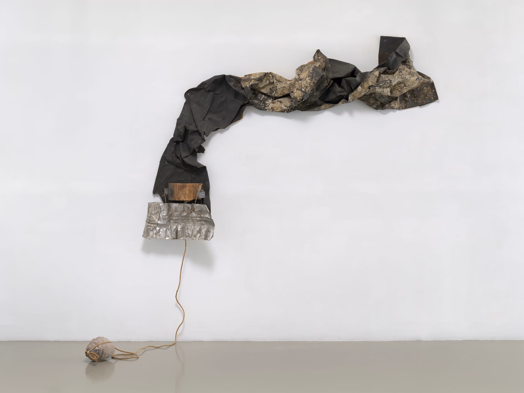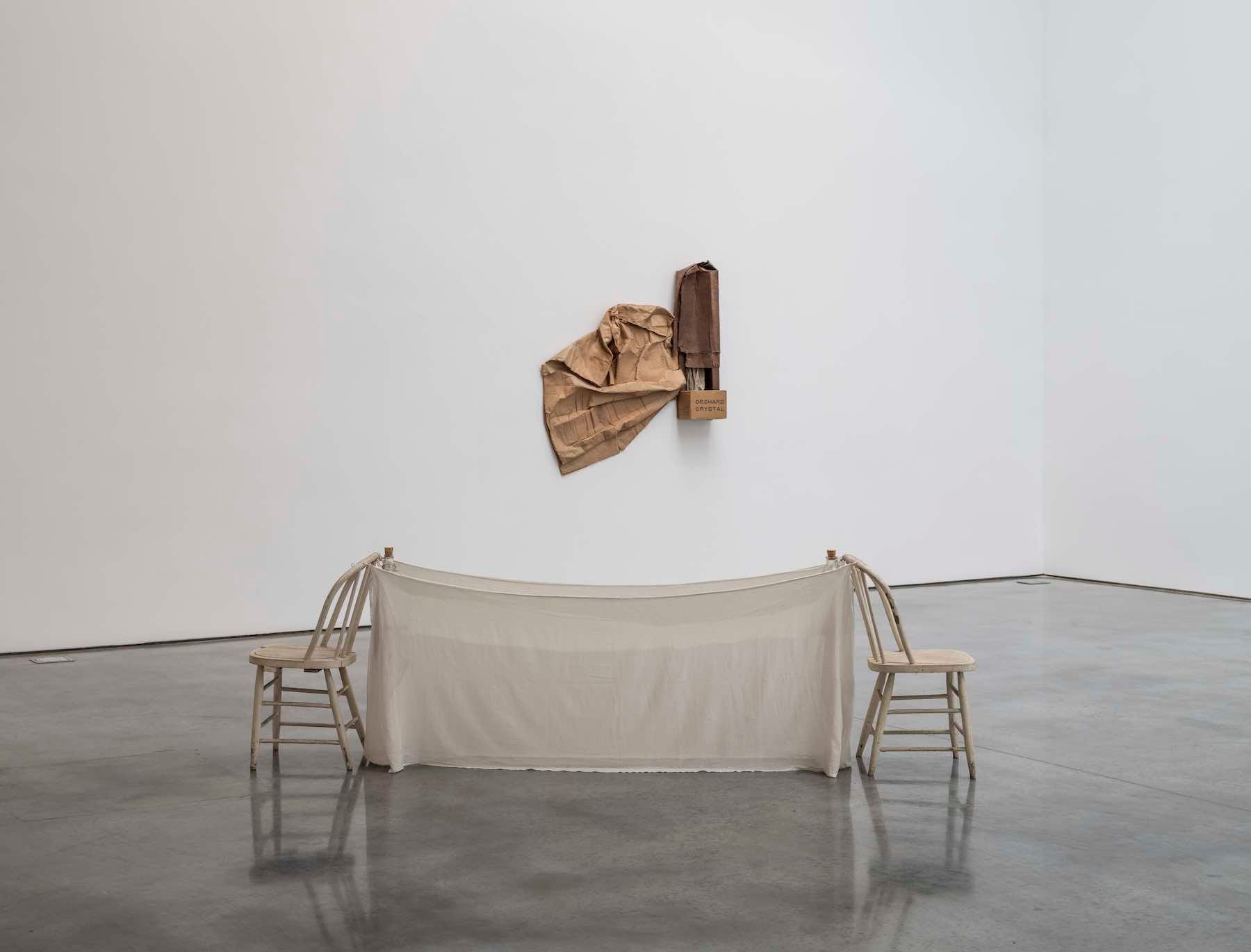 Another work in the show of the same title and year, comprised of fabric wrapped around upright paper bags, recalls a sarcophagus; others yet bring to mind primitive sailboats, hangman ropes, or crude furniture. Including objects like rocks and coconuts — as seen respectively in “Untitled (Venetian)” and “San Pantalone (Venetian)” (both 1973) — Rauschenberg confronted reality head-on.