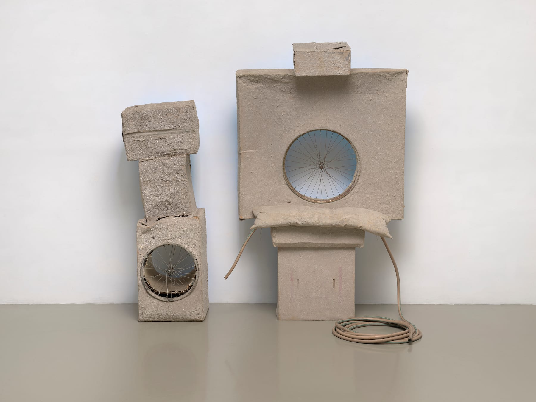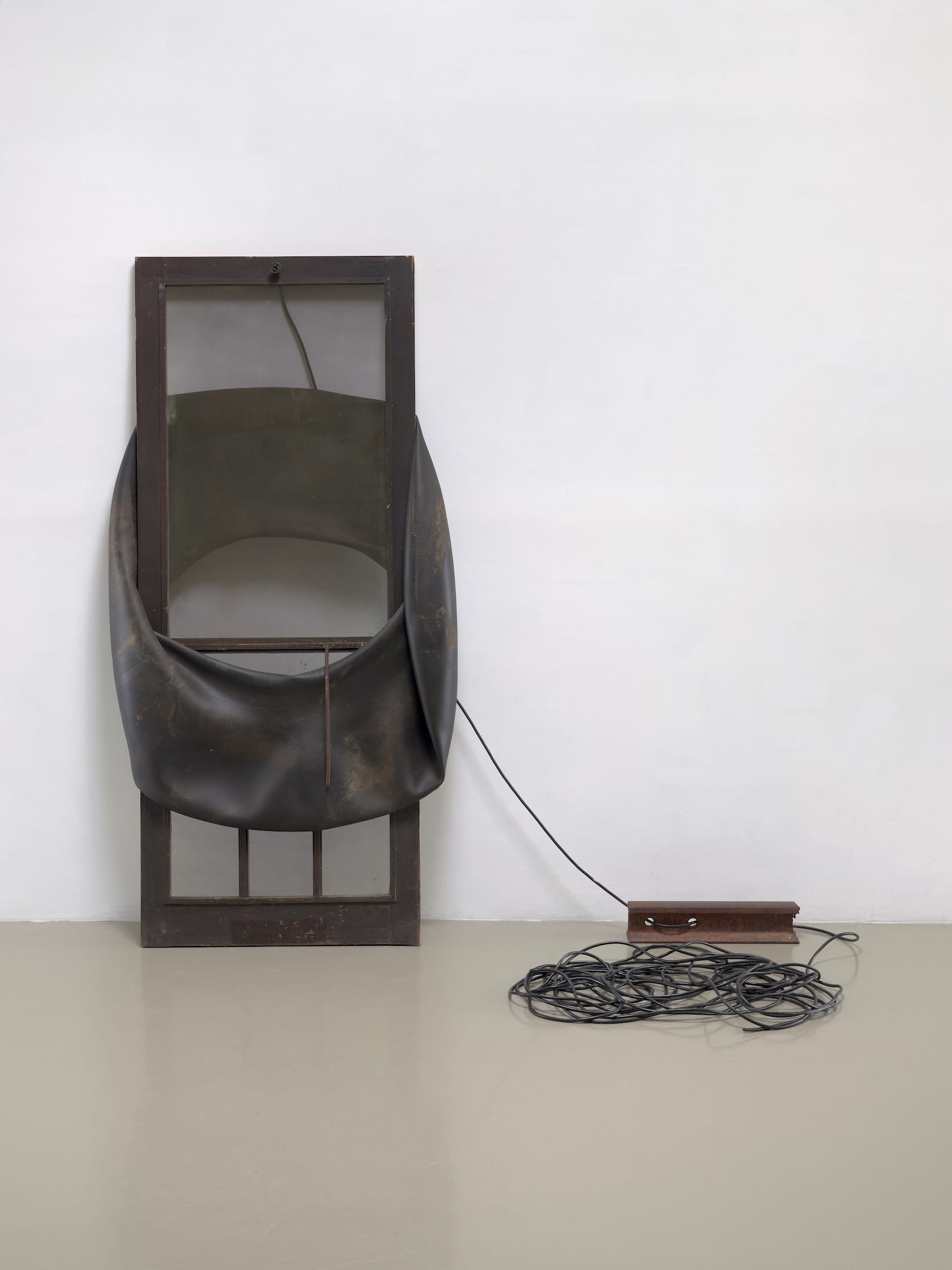 Rauschenberg relocated in 1970 from New York City to a remote island off the coast of Florida, where he lived for nearly four decades and undertook some of his greatest scavenging adventures, collecting and finding inspiration in the urban debris that came to feature heavily in his work. In the spring of 1972, Rauschenberg visited Venice and looked to the city’s paradoxical duality of opulence and austerity, progression and deterioration. Drawing from his shift to a rural lifestyle and his observation of urban facades, his practice evolved to incorporate more neutral palettes, as seen in natural and utilitarian materials like sand, wood, leather, rubber, and cardboard.