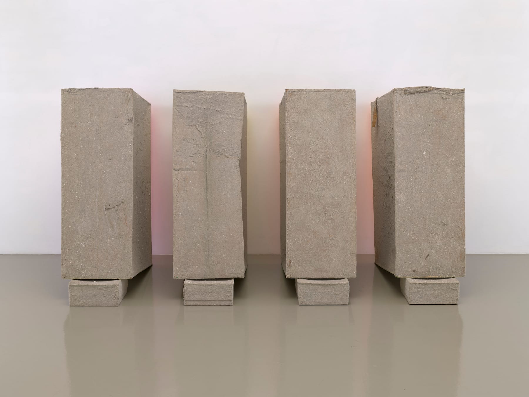 In “Untitled (Early Egyptian)” (1974) at the 24th Street space, four large, vertical rectangular boxes sit atop smaller cardboard boxes, and the entire dais-like structure is coated in sand and acrylic to create a rough-hewn surface texture analogous to concrete or stone building blocks. Referencing Egyptian monuments in its imposing composition, this work demonstrates Rauschenberg’s trust in certain materials to anchor his works to the world around them while reflecting on the cultural and economic history of cardboard and imbuing the common material with a newfound poetic dimension.