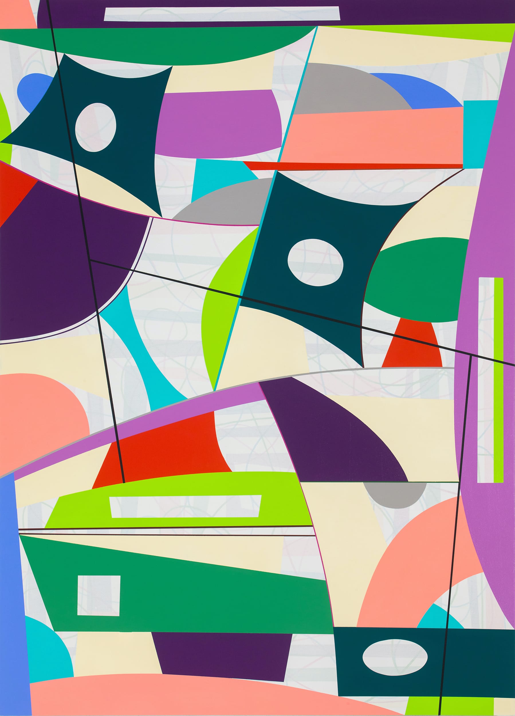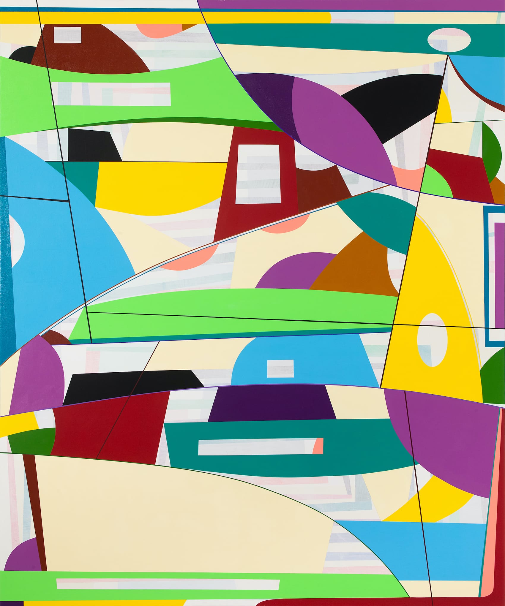 In “Orange Slice” (2021), Petersen has employed dark lines to divide the painting into eight discrete areas. The areas fit into the three large configurations defined by a curving line extending between the left and right edges. Within each of these areas Petersen establishes vertical boundaries with curved and straight lines. The triangular, pie-shaped, orange slice the title refers to extends down from the top edge. Its right side is defined by one of Petersen’s boundary lines, where it abuts with a curved turquoise shape. Petersen further distinguishes the slice by lining its curved edge with a thick yellow and thin pink concentric band, as well as a pink band running along the right edge.