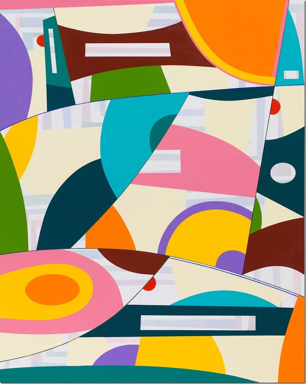 This is just one of the painting’s more than two dozen, mostly curvilinear forms, set against a ground made up of two distinct areas — flat, cream-colored shapes and pale pink and blue bands, as if seen through a white gauze. The slice, along with a purple and yellow pie shape in another area, bring to mind Kenneth Noland’s celebrated targets. This is another shift taking place in Petersen’s work, as he directly alludes here to the history of postwar geometric art and pop abstraction, including Al Held, Ellsworth Kelly, and Nicholas Krushenick.