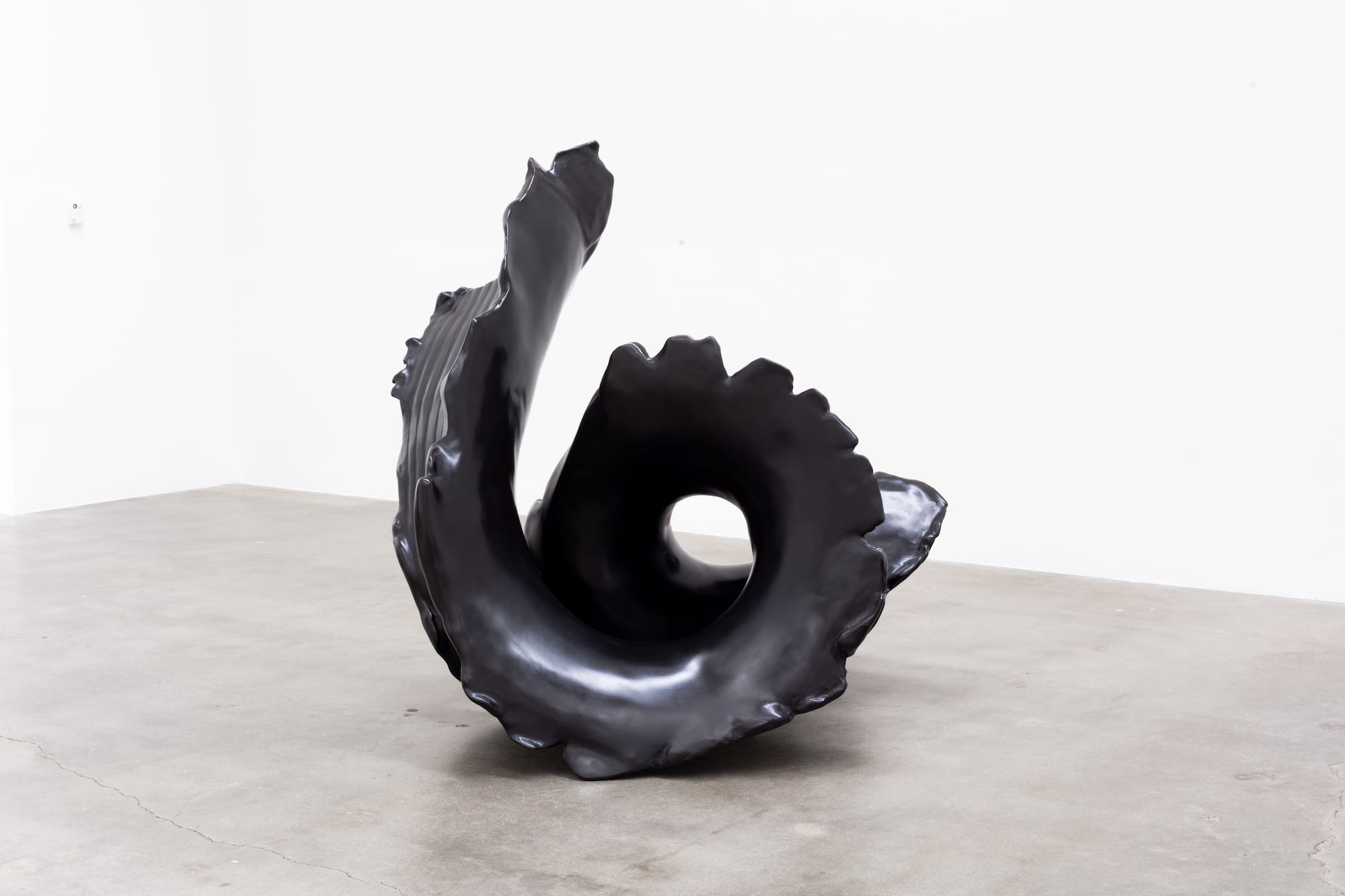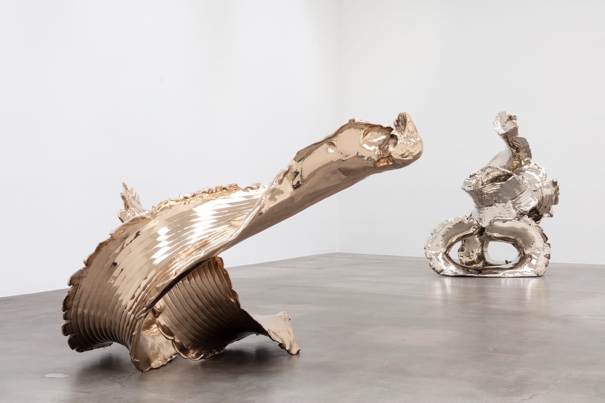 The large sculptures result from a process of 3D scanning the small ones, creating foam models, and then casting the bronze using the lost-wax method. In some cases, the twisting, cylindrical forms of the bronze works evoke tire treads or fragments of blown-out tires, references to motion that use an organic medium to gesture toward the synthetic: the smooth surface of “Black Widow” (2021), coated in a black patina, could be rubber, while its sheen resembles porcelain or a shell, and its unfurling spiral suggests a snail. The most striking of the sculptures are a luminous metallic (high-polished White Tombasil or Everdur bronze). The meandering “Yellow Tail” (2020) twists around itself in a figure eight; springing up from the ground, “Striking Cobra” (2020) surges out into the space of the gallery like a bolt of liquid light.