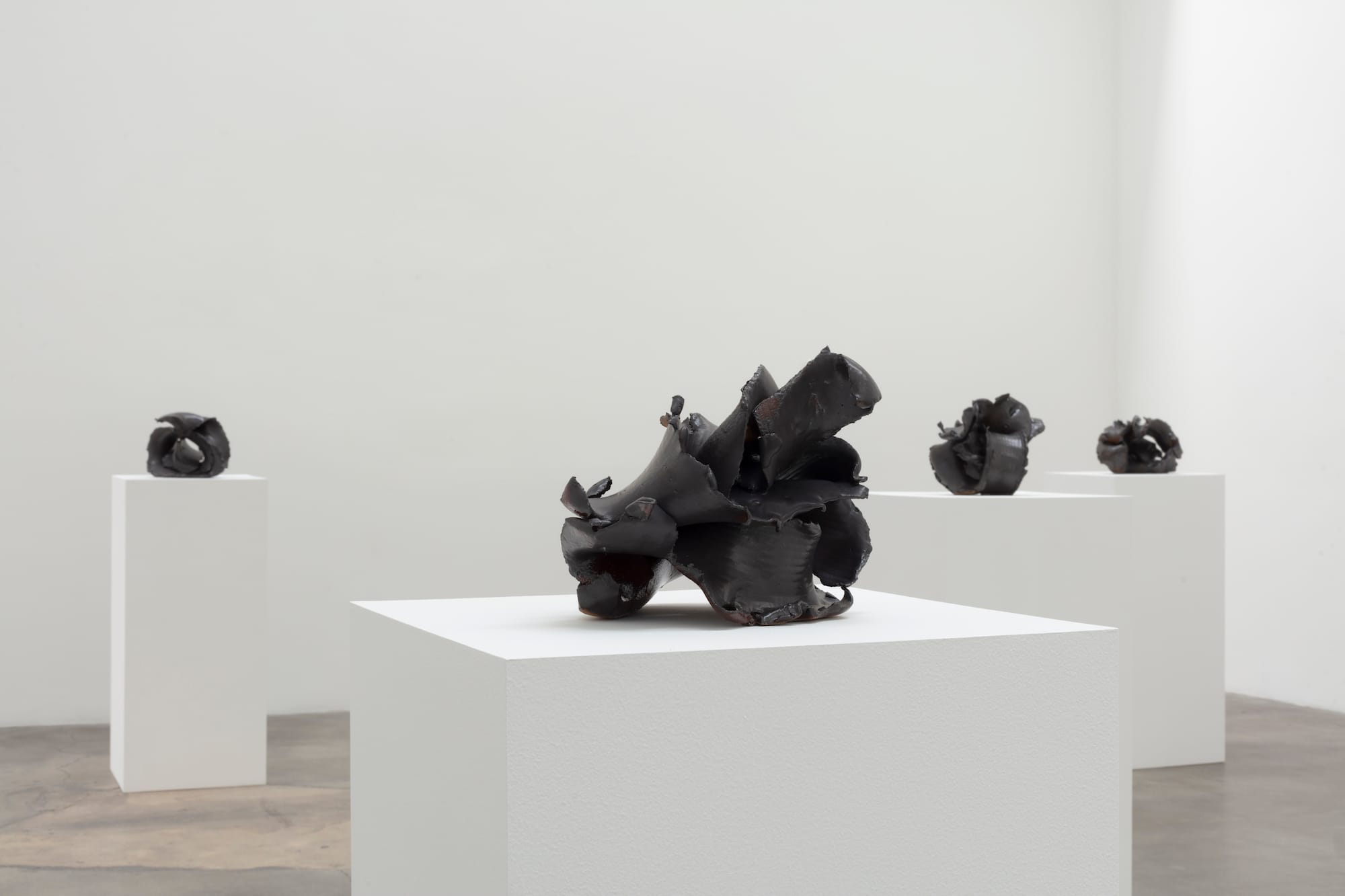 LOS ANGELES — In Lynda Benglis’s latest exhibition, Excavation at Blum & Poe, the sensuality of her sculptures is as seductive as ever, but the forces of gravity that defined her seminal poured latex and polyurethane pieces are traded for lightness. The large bronze sculptures, accompanied by a room of small ceramics, are spiral bursts that further the artist’s inquiry into the “gestural and the knot” as they investigate negative and positive space. This explanation conveys the formal concerns but not the energy of the works, and the sense of ecstatic motion that they capture.