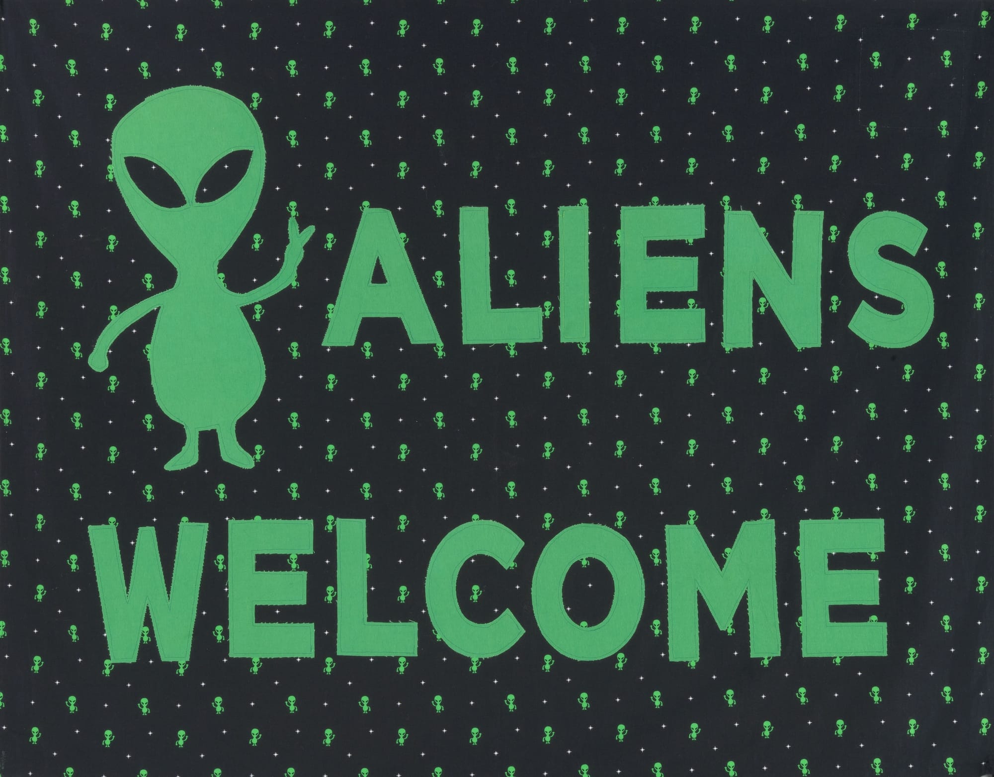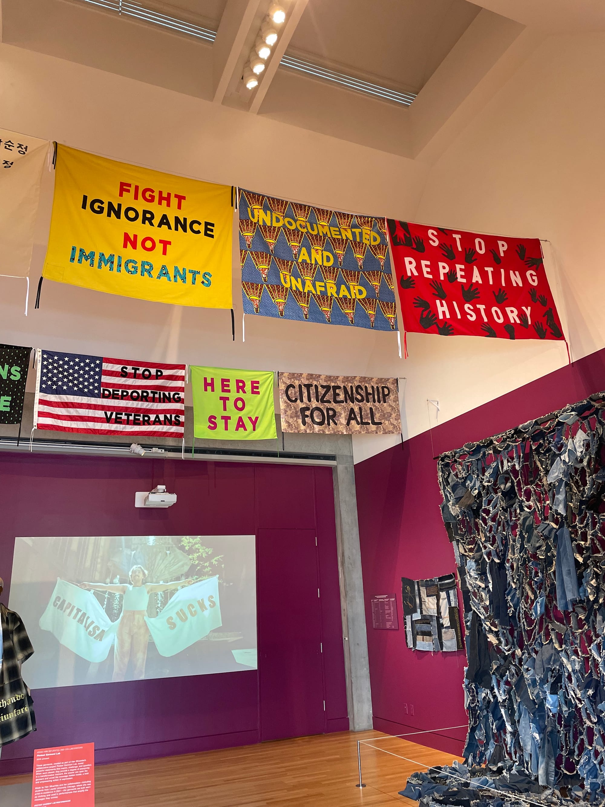 LOS ANGELES — Rhythmic beats of Korean drums and chants fill the hallway before entering the exhibition, almost like an auditory map guiding folks to sites of protest. Upon entering, the pungmul drum beats louder, and the viewer is confronted with colorful, patterned banners, some sewn and some printed. Hung from the ceiling, these banners display messages of solidarity such as a neon green text stating “Aliens Welcome,” next to an equally neon image of an alien in front of notes of commemoration listing all of the Atlanta spa shooting victims in March of 2021. Behind the banners on a wall projection, members of Woori Sori — an all-women Korean percussion group based in Chicago — smile and nod to each other as they drum with a quiet joy. The work is part of the exhibition Talking Back to Power: Projects by Aram Han Sifuentes at the Skirball Cultural Center, which puts on full view the labor of immigrant women as they find footing in a new country.