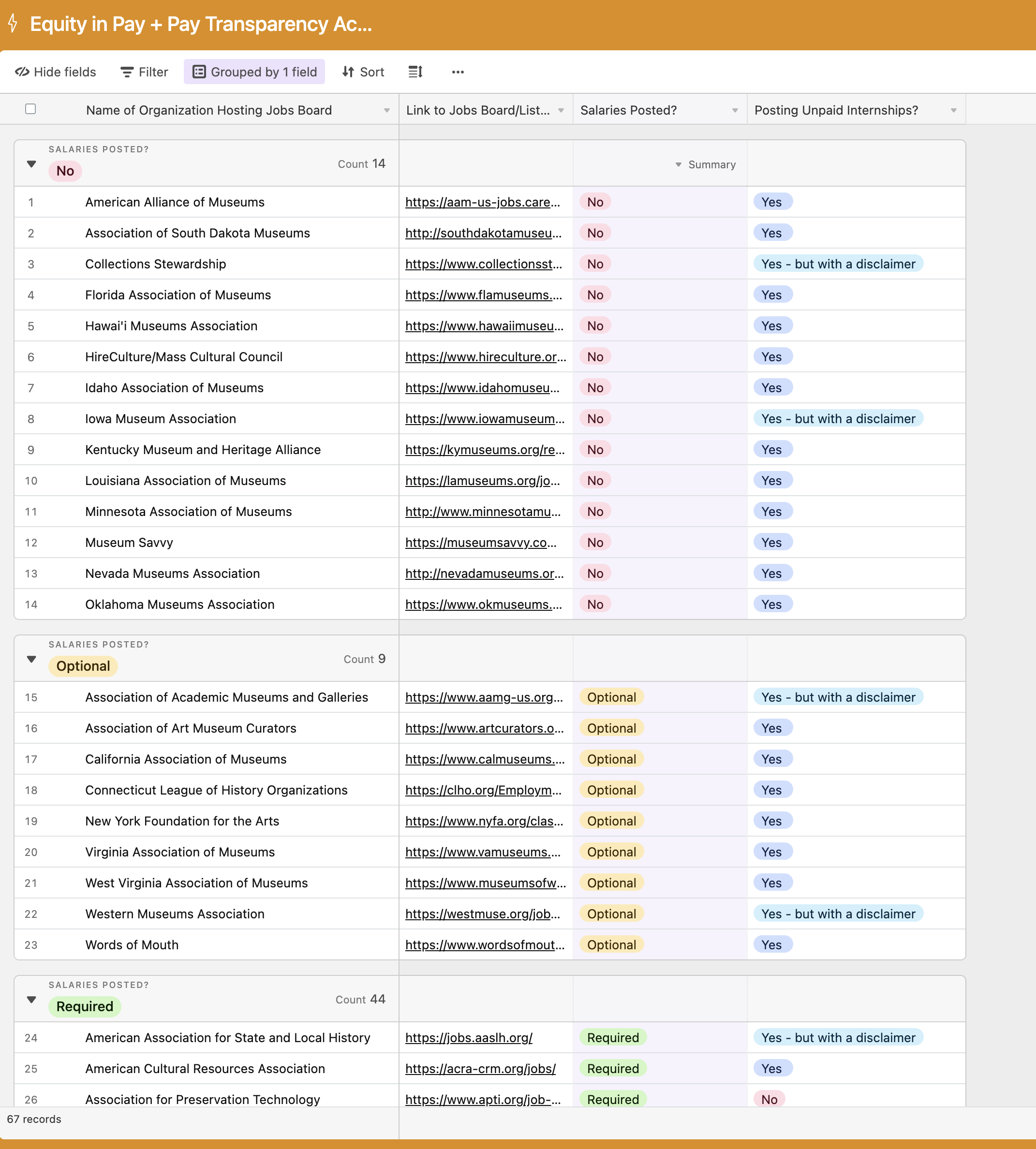 The new database shows that some of the museum world's most important organizations, like the National Trust for Historic Preservation and the American Cultural Resources Association, already require salaries to be posted. Others do not, including the American Alliance of Museums (AAM) (although AAM does urge employers to "be transparent about salary" and "not ask for salary history" in an Equitable Hiring Practices section of its website).