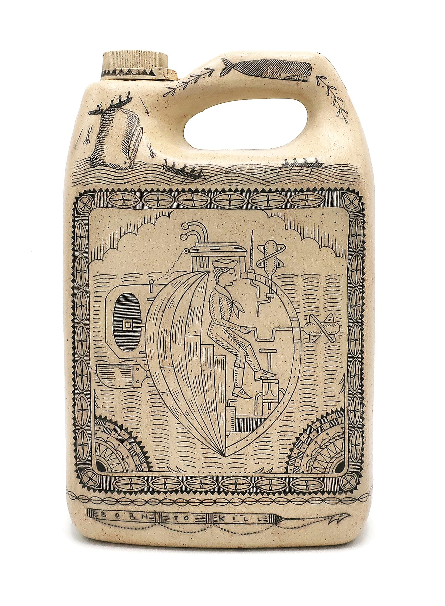 The vitrines showcasing clusters of the artist’s imitation scrimshaw have a similar effect. Inspired by 19th-century sailors’ carvings onto whale teeth, and occasionally displayed alongside examples of actual scrimshaw from the museum’s collection, Riley’s pastiches are made from salvaged plastic objects, each painted bone white, with black ink hatch work decorating their faux-antique surfaces. At a glance, the vitrines of ersatz scrimshaw radiate museological credibility. But upon closer inspection, the individual works’ forms (a laundry detergent bottle, a bear-shaped honey bottle, a toilet seat) and contents (portraits of capitalist tycoons, mock-heroic US iconography; birds and fish projecting menace or calm) tend toward farce. Each fake scrimshaw object has a numerical title that purports to catalogue the work’s location in the fictitious collection of the spoofily named “Poly S. Tyrene Memorial Maritime Museum.”