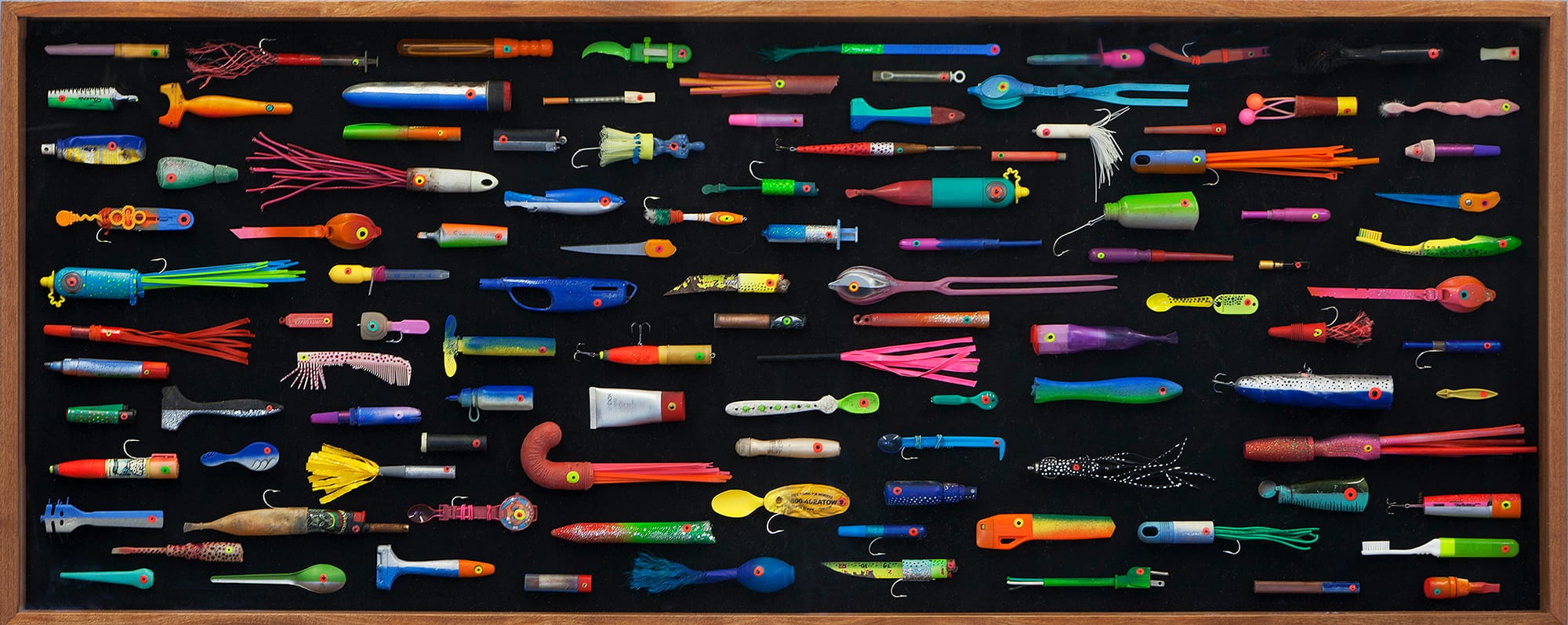 “Remember to hit that like button and subscribe,” deadpans Duke Riley at the end of “Welcome Back to Wasteland Fishing” (2019), “It really helps.” Projected in the entry room of his Brooklyn Museum exhibition DEATH TO THE LIVING, Long Live Trash, the short video — a parody of a YouTube fishing tutorial — depicts Riley aboard a boat using lures he made from discarded plastic tampon applicators. Examples of the lures hang nearby in “Duke the Fisherman’s High Quality Fluke Rigs Made in the USA™” (2022), which consists of a pegboard designed to resemble a display case in a bait and tackle shop. Each applicator in the display has been sculpted to evoke a cutesy squid and comes attached to bright cardstock packaging emblazoned with the acronym “DTF,” notionally standing for “Duke the fisherman” but also slang for “down to fuck.”