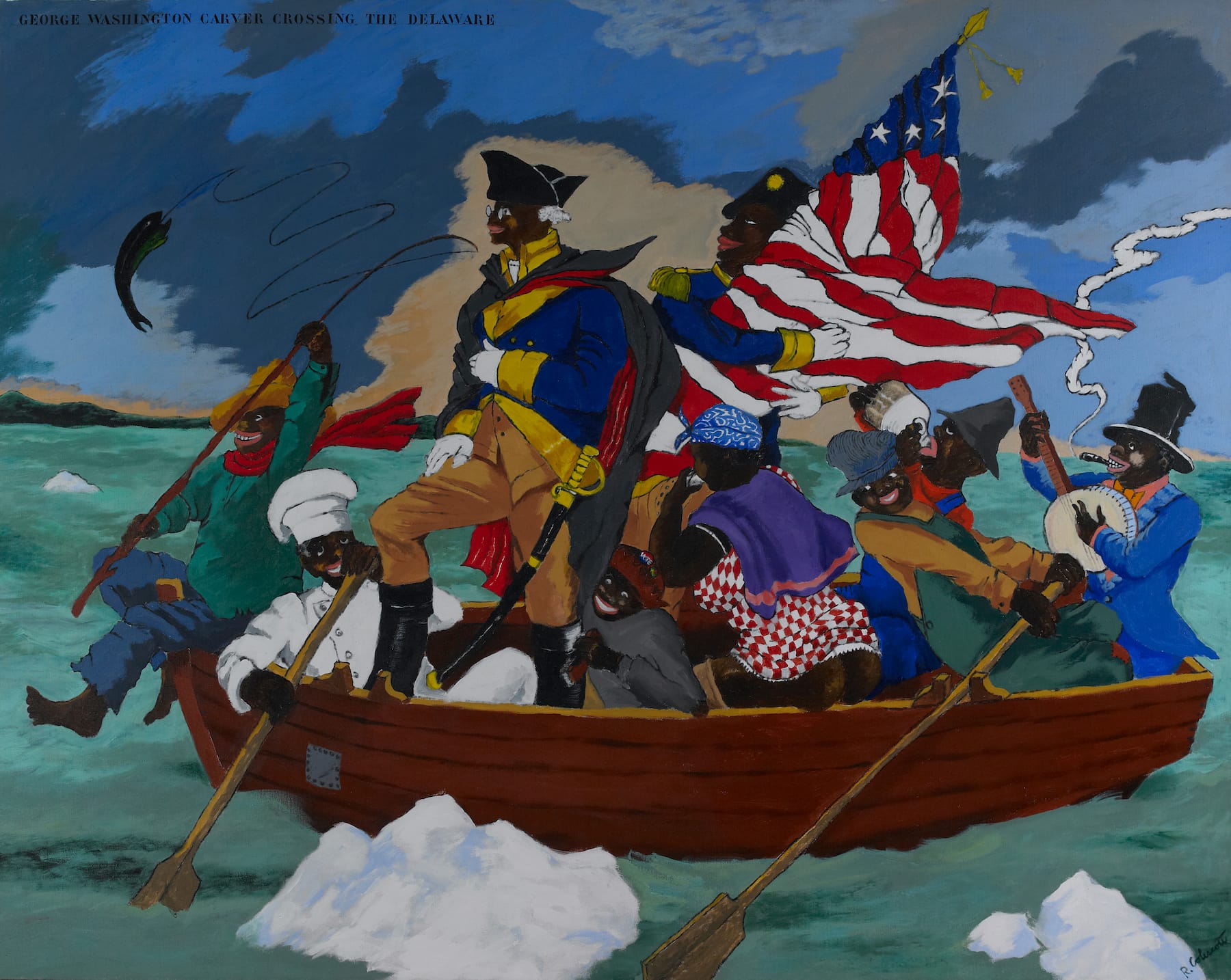 When I walking through Robert Colescott’s exhibition Art and Race Matters, currently on view at the New Museum in New York, I was unexpectedly reminded of a line from Robert Lowell’s poem “For the Union Dead”: “Their monument sticks like a fishbone/in the city’s throat.” I can think of many appropriate substitutes for “city’s throat,” starting with “art world” and working down to museums and the individuals who proclaimed that painting was dead around the time Colescott exhibited his best-known work, “George Washington Carver Crossing the Delaware: Page from an American History Textbook” (1975). I would even say that the fishbone metaphor applies to those in the 1980s who announced that painting had returned, as if it had ever gone away or gotten lost, like a dog that could not find its way home until Julian Schnabel came along.