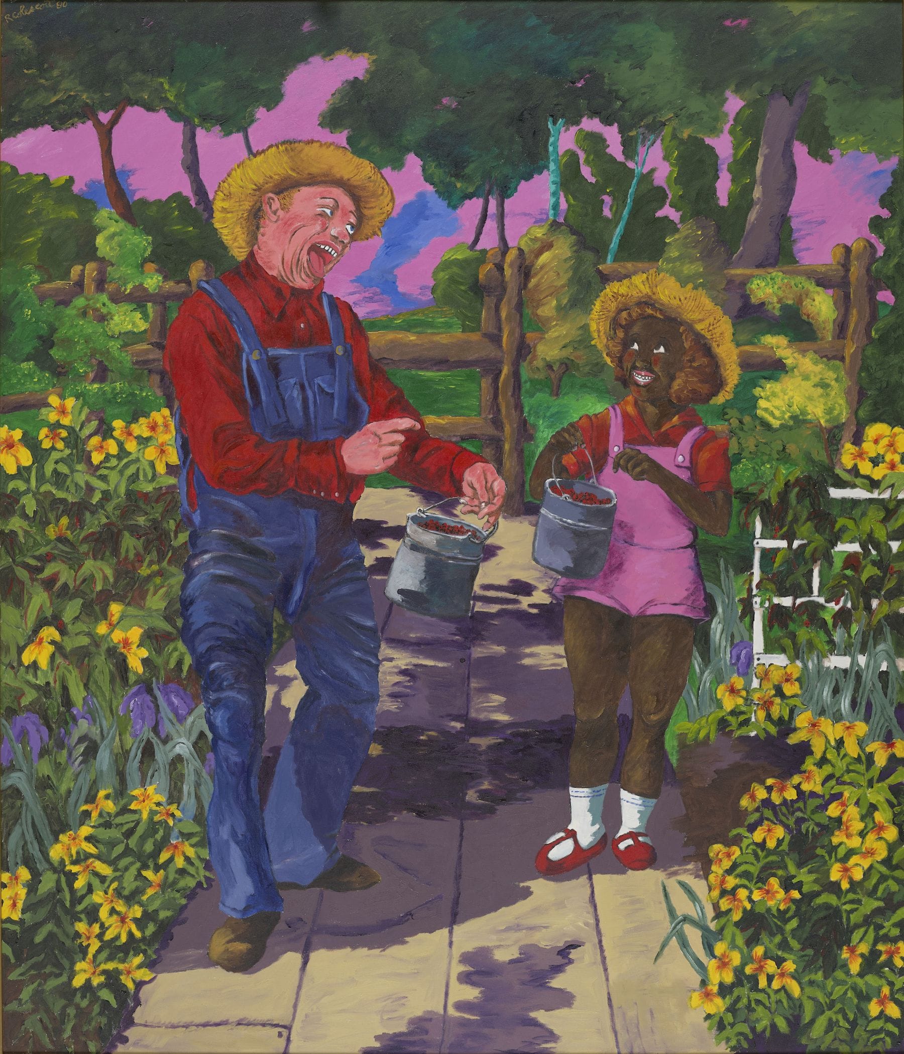 In “Shirley Temple Black and Bill Robinson White” (1980), Colescott took advantage of the childhood star’s married name to make a switch, depicting her as a young Black girl and the Black tap dancer and actor Bill “Bojangles” Robinson as White, which is a comment on the happy subservience he projected in films. Colescott’s depiction of Robinson as a White man in blue coveralls and a red shirt, holding a pail of raspberries and singing to a smiling Black girl with exaggerated red lips, looking up at him with wide eyes, is beautifully ludicrous. The stage-like setting, with a bubblegum pink and blue sky and blue tree trunks forming a backdrop, attests to the artist’s masterful use of color.