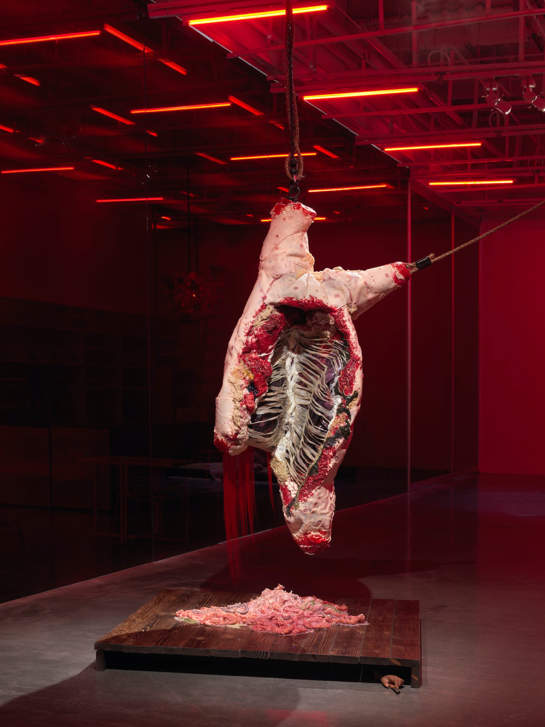Three of the four sculptures on exhibit focus on the Middle Passage — the stage of the Atlantic slave trade in which millions of enslaved Africans were transported to the Americas. Of roughly 12.5 million enslaved Africans transported through the Middle Passage, approximately 15 percent (almost 2 million) died during the voyage. In the center of the gallery, "The Feast of the Hogs" — a diseased, disemboweled carcass — hangs from the ceiling in a nod to Rembrandt's "Slaughtered Ox" (1655) and Soutine's "Carcass of Beef" (c. 1925). In Garner's work, the bovine becomes the swine — positioned as a vector of infection. The hog refers not only to European colonizers but also to the forced consumption of diseased livestock on slave ships. A Black hand holding a knife emerges from under a platform, teasing the theme of resistance that runs through the exhibition.