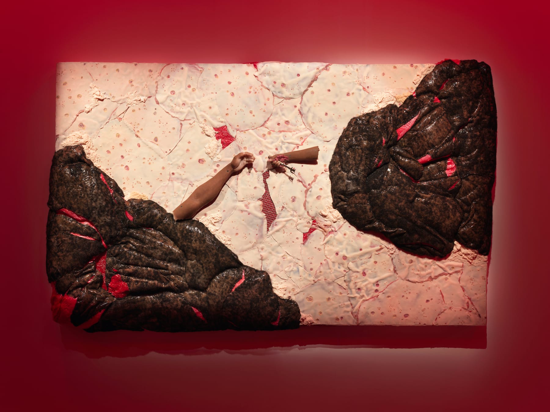 The artist takes aim at religion's role in the institutions of slavery with "Take This and Remember Me" (2022) by recreating the composition of Michelangelo’s “The Creation of Adam” (1512). God giving life to Adam is replaced by a Black hand passing a weapon to another Black hand — the beginning of the New Brittania revolt.