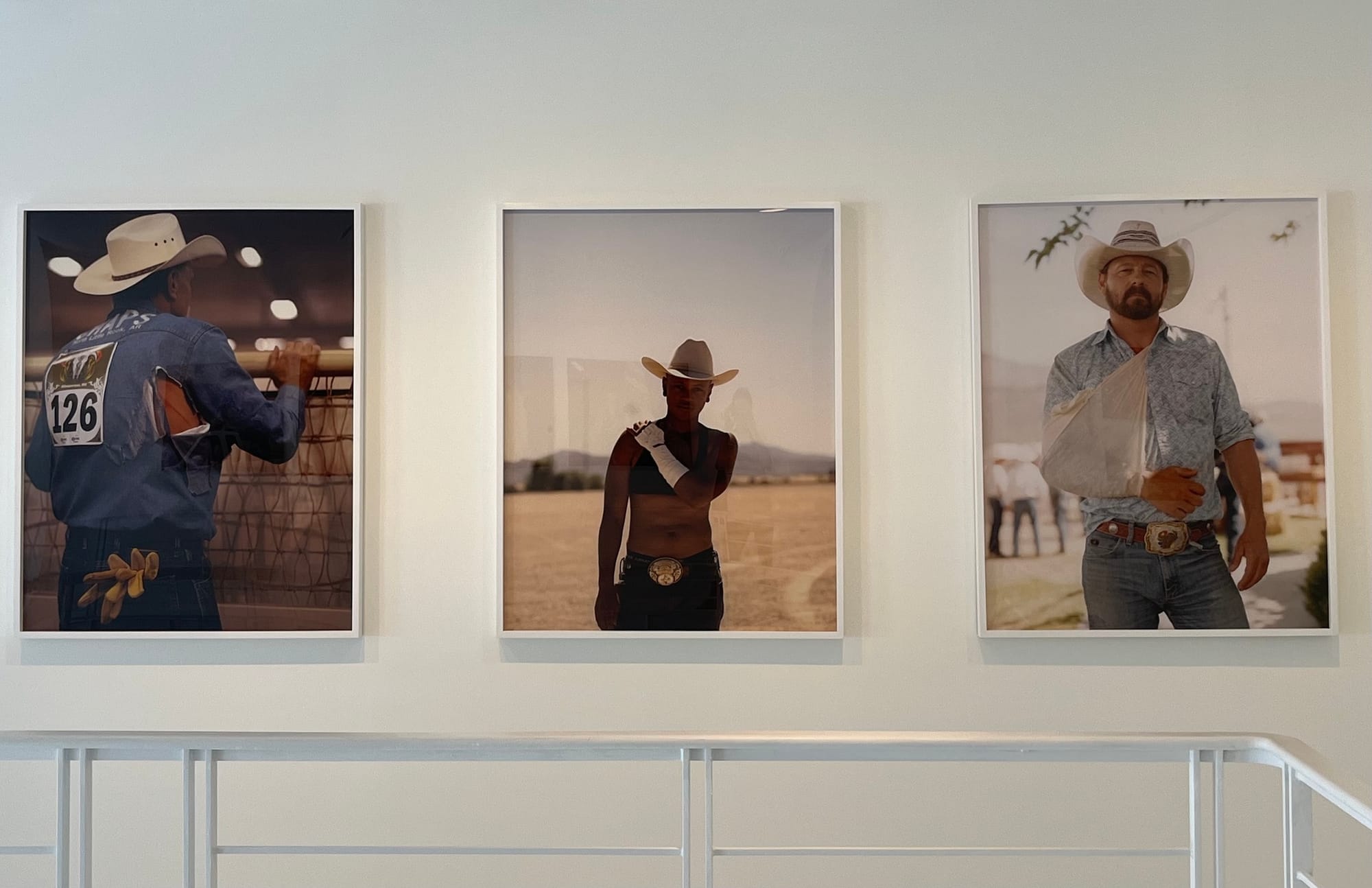 Luke pointed to three photographs grouped together on the gallery's upper level as personal favorites. On the left, a figure stands with a gash in his denim shirt; in the center, a different subject places their arm, in a cast, over their shoulder; and on the right, another stands tall and proud, holding his arm in a sling. All three men pictured had been injured in rodeo events.