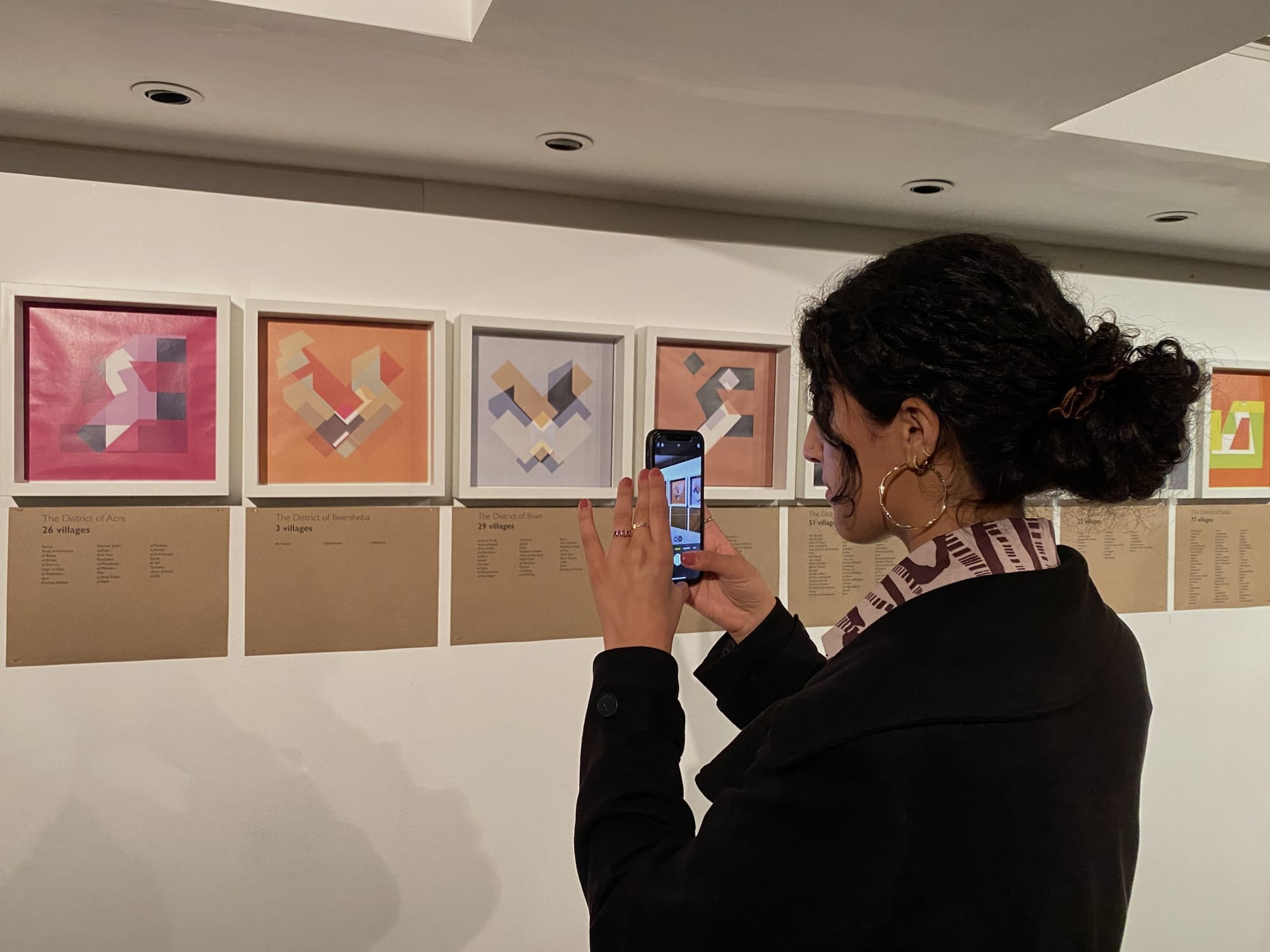 The exhibition features experimental modes of artistic interpretation. One work, 418 (2023) by Yahya Zaloom, is a color-coded series of 14 digital prints which geometrically represent the dispersed Arabic letters of 14 districts as an ode to 418 localities that were systematically depopulated and destroyed by Zionist paramilitaries.