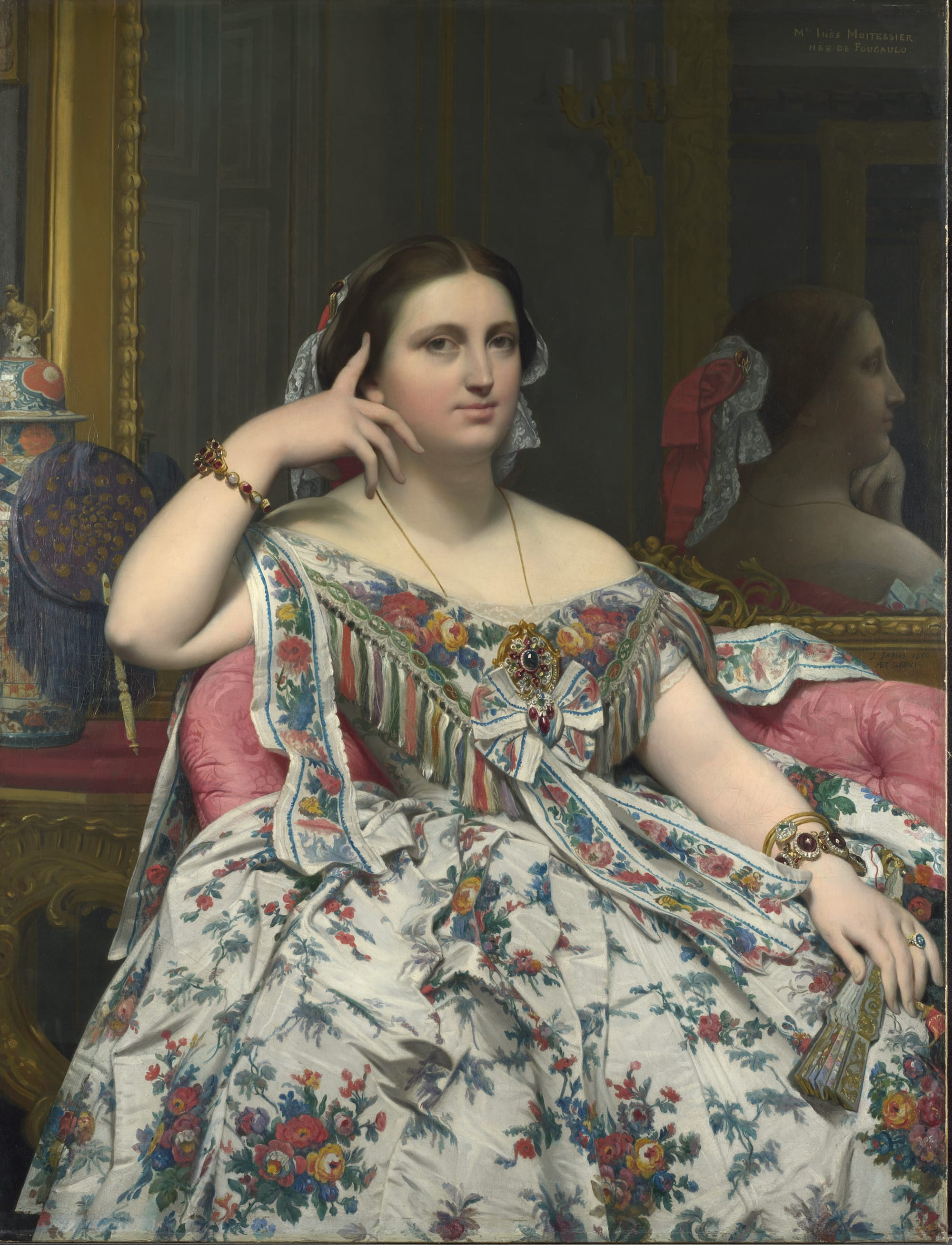 These two paintings hang a yard or so from each other, on the same wall. Otherwise, barring a few words of interpretation and a well-sculpted yellow line, the gallery is completely empty. They have certain fundamental characteristics in common. The sitters’ pose is the most obvious and the most eye-catching feature, how they are seated face forward, right arms raised, index finger pushing into the side of the head — Marie-Therese’s finger lands at her upper cheek (just beside its pinkish blush), Madame Moitessier’s at the temple, tamping down her brown hair. Madame holds a closed fan, Marie-Therese a book, fanning open. In other respects too, there is much to separate them.