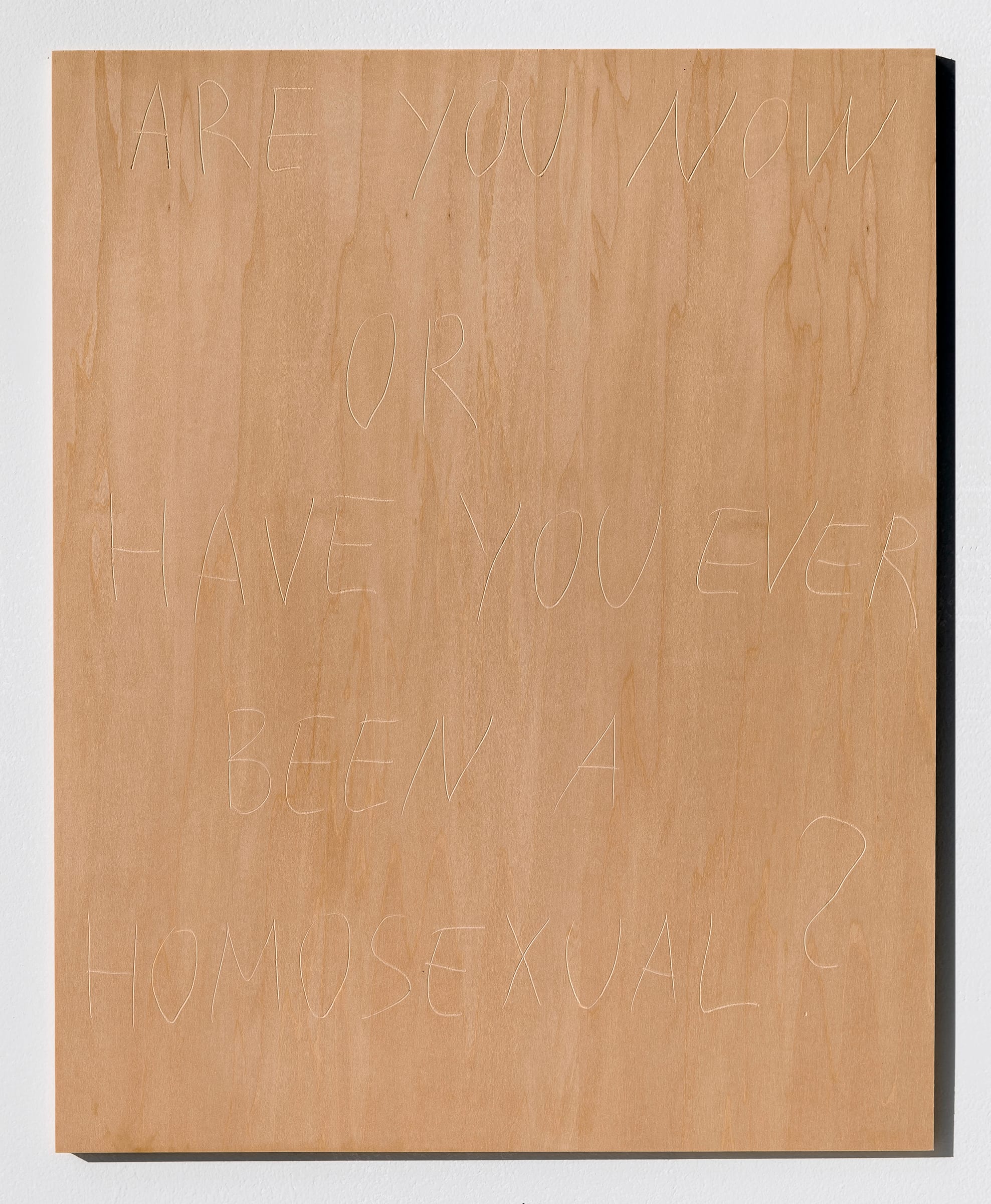 An entire gallery corner likewise honors the memory of late queer theorist Harry Hay, who co-founded the Mattachine Society and Radical Faeries after being forced out of the Communist Party USA in the 1940s for his sexual orientation. A display case contains pictures and printouts of his many manifestos and pamphlets, such as "Radical Commonality" and "The Homosexual’s Responsibility to the Community." On the adjacent walls, Russian artist Yevgeniy Fiks narrates the contradictions of Hay’s experience as a communist and gay man on sanded wood templates. Fiks’s scrawled handwriting is barely perceptible against the smooth surface, hinting at the subversive nature of his politics and sexuality in a nakedly capitalist state.