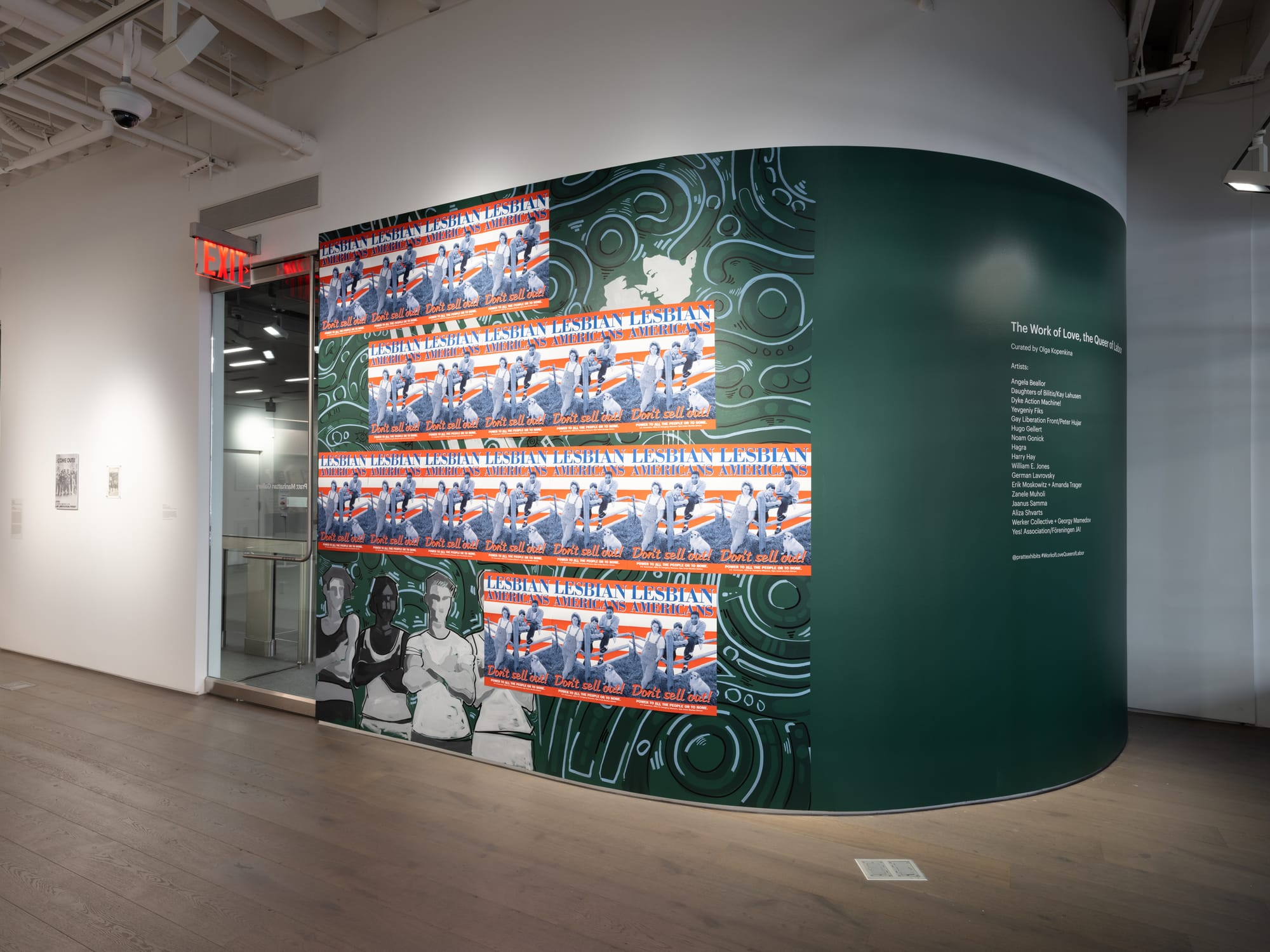 Visible from the window on 14th Street, copies of Dyke Action Machine's poster series Lesbian Americans: Don’t Sell Out (1998) urge passersby to reject rainbow capitalism, overlaying a mural painted by Pratt student Eliette Mitchell. The mural's green and gray backdrop brings out the posters’ red, white, and blue palette, transforming American heartland aesthetics into a rejection of capitalist values. Beside this, a photograph of queer Catholics on a picket line, published in The Ladder: A Lesbian Review by the Daughters of Bilitis, is placed next to a poster of Peter Hujar's iconic Gay Liberation Front photograph, evoking today's struggle between trans-exclusionary radical feminism and the non-traditional queer family.