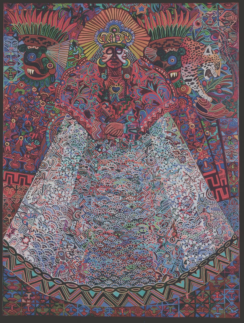 Sandy Rodriguez’s painting “Mapa for My Malinche and our Stolen Sisters” (2021) welcomes visitors into the Albuquerque Museum’s exhibition Traitor, Survivor, Icon: The Legacy of La Malinche. The show presents a reinterpretation of the turbulent story of La Malinche, the Indigenous woman who translated for Hernan Cortés during the Spanish invasion of Central Mexico. Some consider her the “Eve” of Mexico, while others criticize Malinche for her role in colonization. Yet, she continued to promote diplomacy during her negotiations.