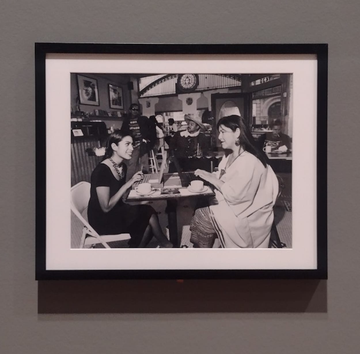 The “La Lengua” section underscores Malinche’s role as Cortés’ Lengua, his “tongue” during their chronicles, highlighting Malinche’s essential role as translator and primary communicator. Robert C. Buitrón’s “Malinche and Pocahontas gossiping with PowerBooks” (1995) focuses on this element from a contemporary perspective. His black and white photograph shows two sitters speaking in the foreground, asserting themselves as protagonists. Their communication is the point of contact for opinions and information, replicating Malinche’s powerful position as the link between the two communities. Their dialogue prompts viewers to consider Malinche as an active agent rather than a passive figure.