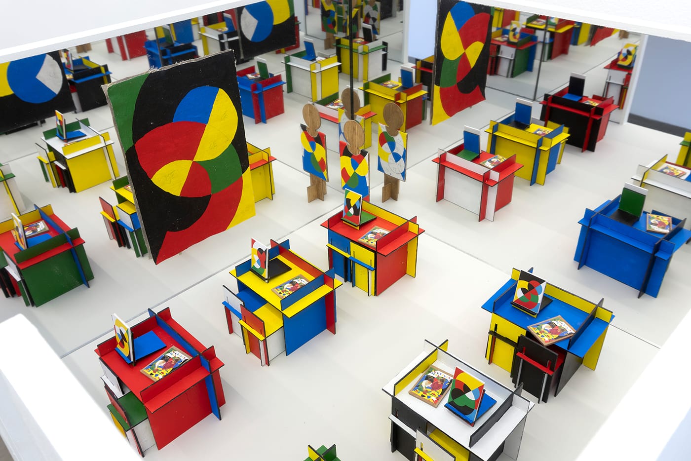 The State Art Academy, Zürich (SKZ) is a fictional modernist art school akin to the Bauhaus, brought to life through painting, performance, and sculpture. This elaborate ruse is the work of LA-based contemporary artist Dan Levenson, who has created faux-aged geometric abstractions supposedly painted by the school’s students and weathered studio furniture, even going so far as to invent a class roster using an algorithm and a Swiss phone book. Two Proposals for the Formation of a New Art School features two miniature classrooms and associated works: one based on actual art classes for children which employed the imaginary SKZ curriculum devised by Levenson, and another in which the roll of a die is used to determine color choices, interjecting an element of play and chance into pedagogy.
