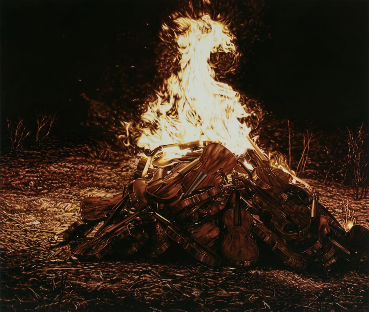 Julie Comnick has been working with fire since 2012, when she launched her Arrangement for a Silent Orchestra project examining the scale and pace of cultural destruction. She’d played violin for many years, and decided to use the instrument as a symbol of classical cultural traditions for a series of paintings and videos that showed a large pile of violins being consumed by fire in the landscape.