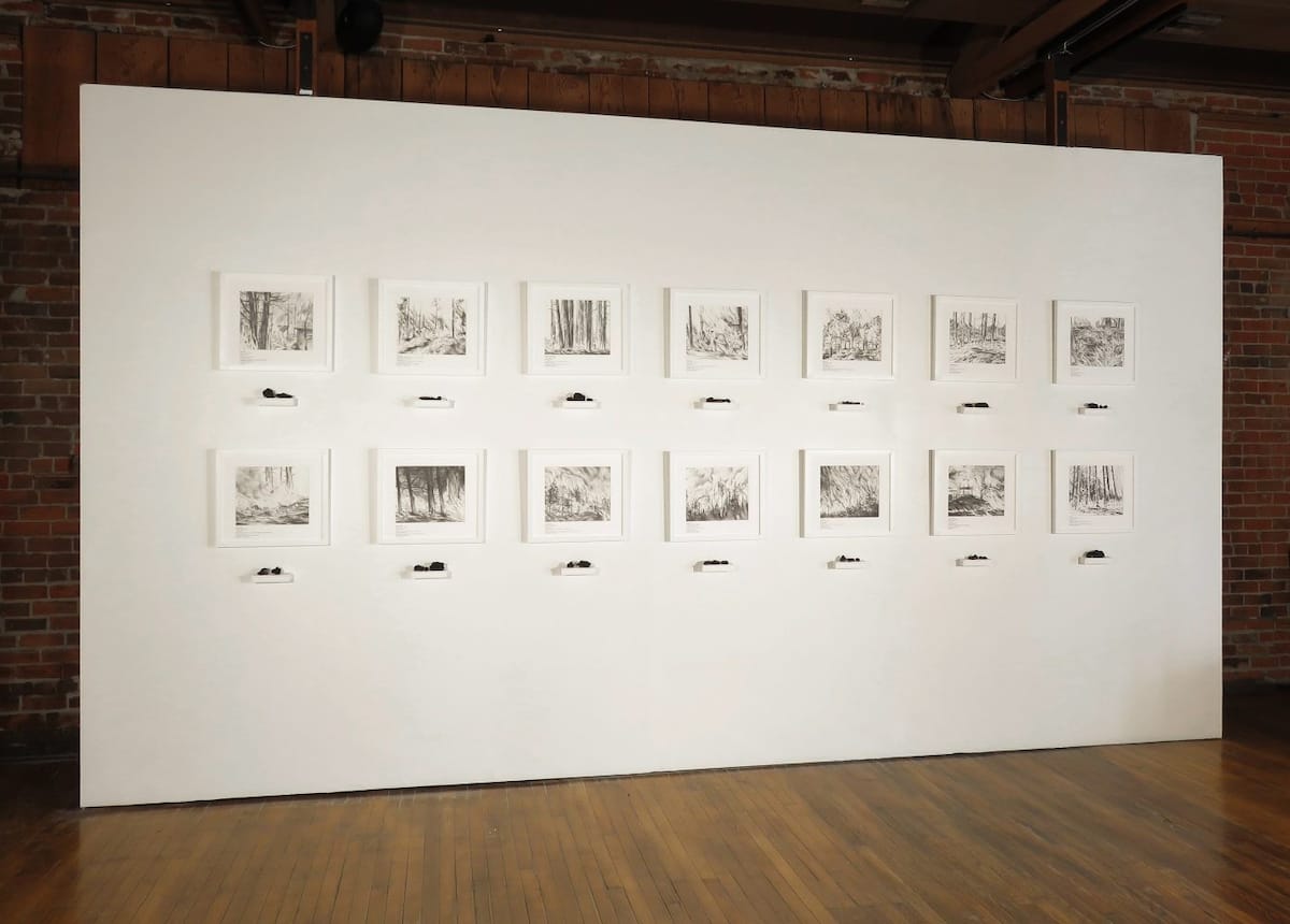 Before moving to Flagstaff, Comnick lived in Prescott, Arizona, where the Duce Fire came within a mile of her house in June 2013. That same year, lightning sparked the Yarnell Hill Fire near Prescott, which became one of the state’s deadliest wildfires on June 30, when 19 of 20 Granite Mountain Hotshots lost their lives battling the fire. “What we face in terms of ecological systems feels like things are spiraling out of control,” said Comnick. “We’re seeing the displacement of people, flooding from fire scars in the landscape, and other impacts of climate change accelerating.” For Fires of Change, Comnick presented a dozen works from her Ashes to Ashes series addressing ecological themes. The series pairs her drawings based on archival photographs of Arizona wildfire sites with pieces of charcoal she’s sourced from those same locations.