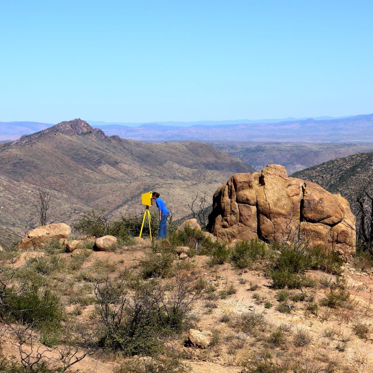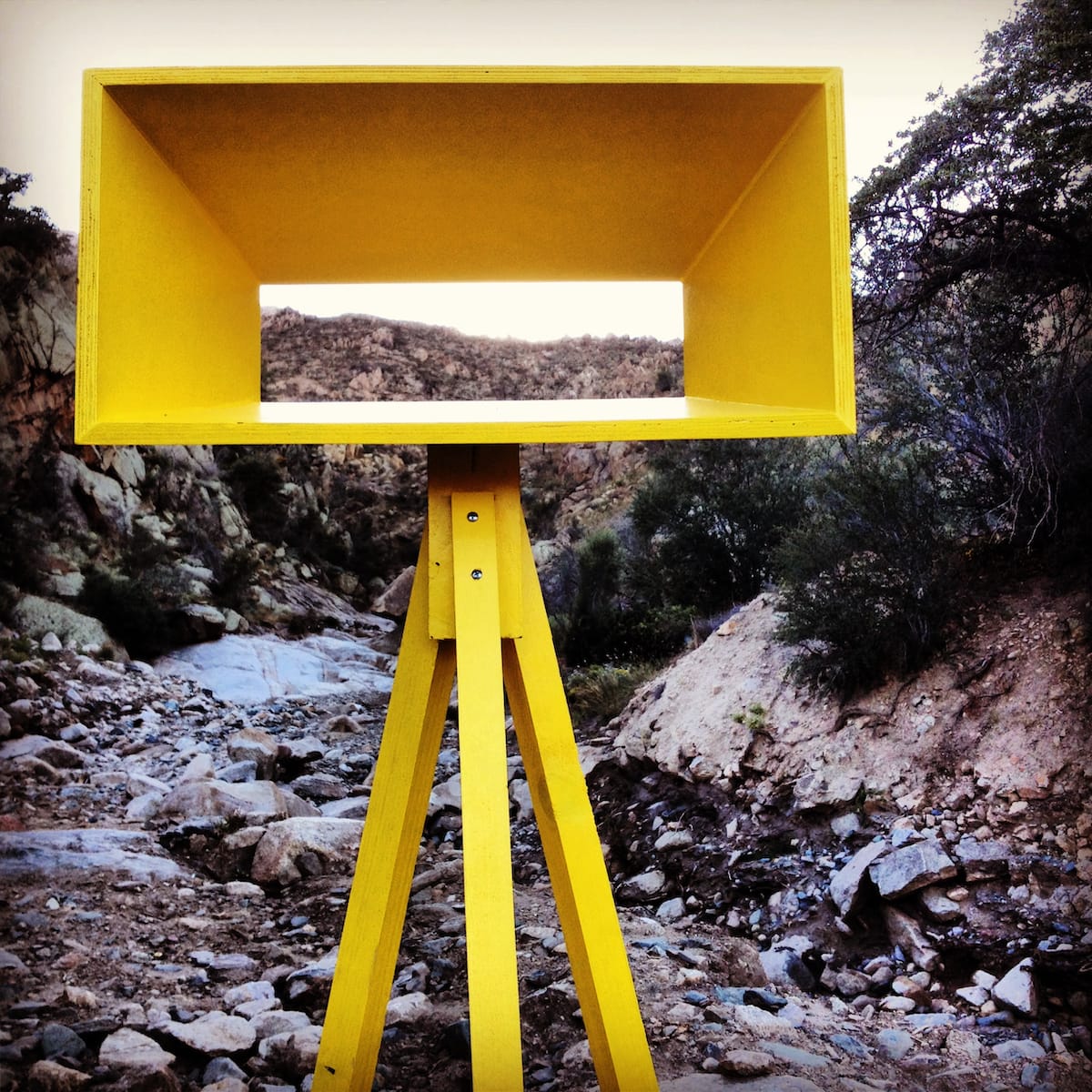 In 2013, Jordá and Sidy installed a series of bright yellow viewing stations along the path of the Gladiator Fire, and created a map to help provide context for viewers. Titled “Hotshots,” the work was installed for High Desert Test Sites 2013 and featured in the recent Disturbances in the Field exhibition at the Nevada Museum of Art in Reno.