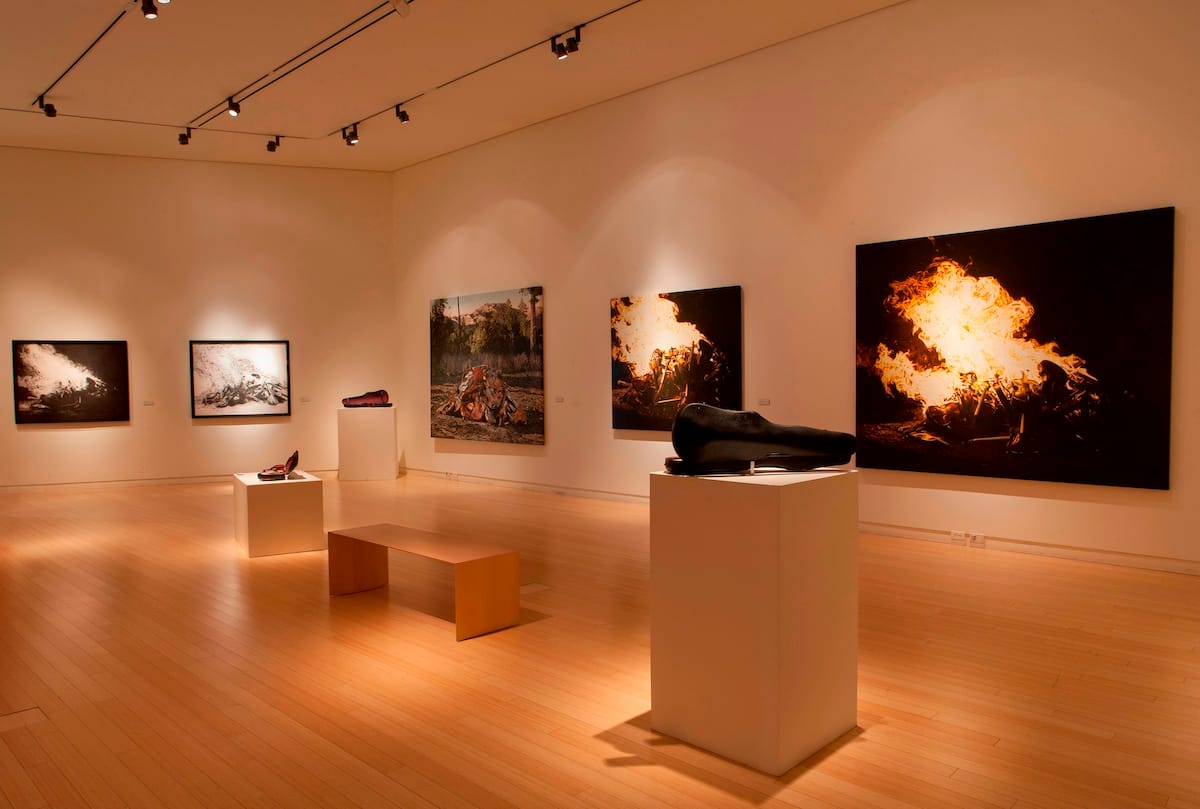 For Arizona-based artists using fire to probe the depths of cultural and ecological destruction, monumental works recently exhibited at Phoenix Art Museum, including Cornelia Parker’s “Mass (Colder Darker Matter)” (1997) and Teresita Fernández’s “Fire (United States of the Americas), 2,” (2017–19) provide valuable context. Parker used charred remains from a church fire to create a form suspended from the ceiling and Fernández used solid charcoal elements to render a map of the United States.