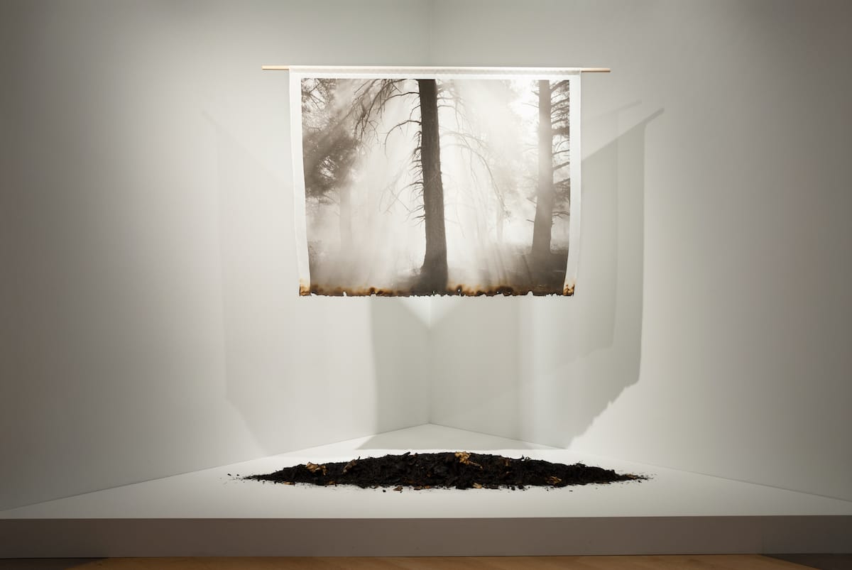 That’s just what Griffith did, working in the home studio the fire never reached in 2014. Instead of centering the photography at the heart of his existing art practice, Griffith created installation pieces using fire-related materials such as trees, burnt embers, and leaves gathered from the forest floor to prompt conversations about ecological destruction, habitat loss, and climate change. “I wanted to bring people into the visceral, sensory experience of a fire that’s still smoldering, using simple materials like burnt wood and smoke to help people connect with the forests they may never get to experience in person,” Griffith said.