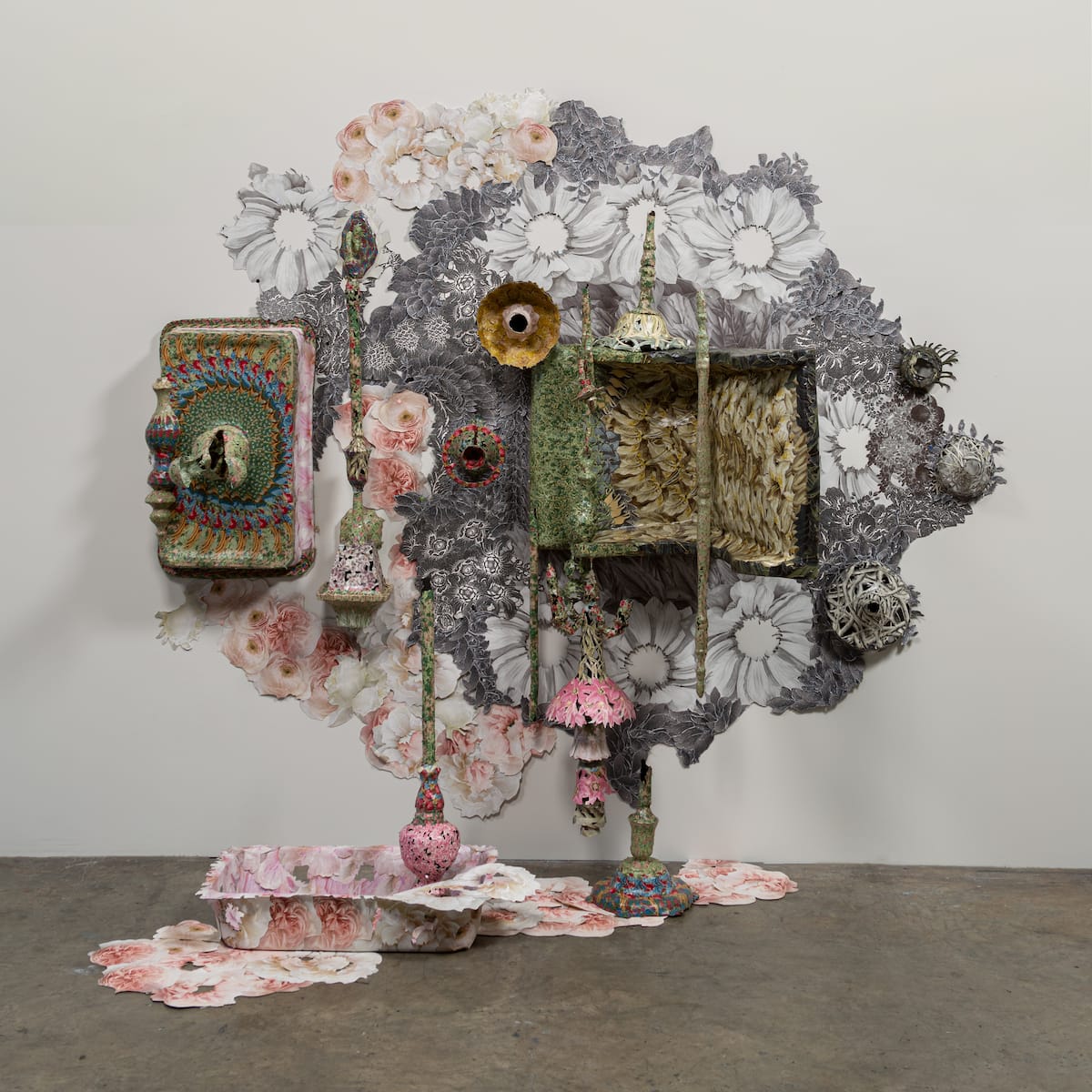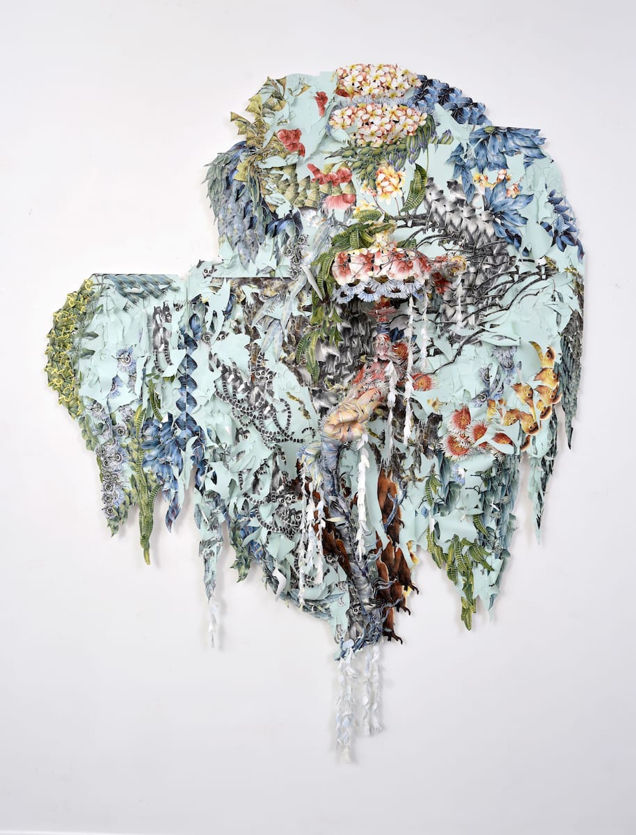 Repeated images of tropical plants and animals form a spidery thicket around a protrusion that looks like a dislocated joint. Above it, a relief resembling a fountain drips with fringe that gently stirs. It’s as though something — or someone — is about to crack out of this paper cocoon.