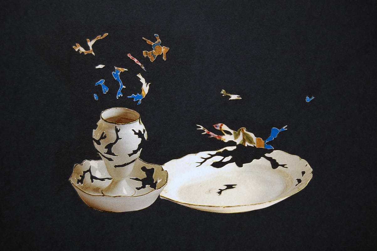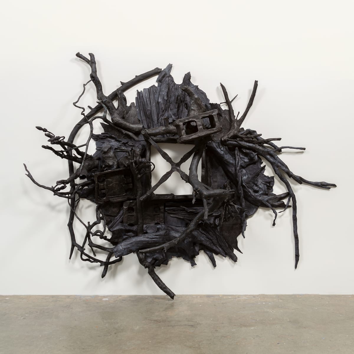 More hollow paper casts of household objects (chairs, lighting fixtures, a sink) form vertical topographies on either side of a wall, referencing tangles of debris from the overlapping catastrophes. One side is enrobed in vibrant wallpaper bits, the other is painted matte black and dusted with fragments of gold tinsel.