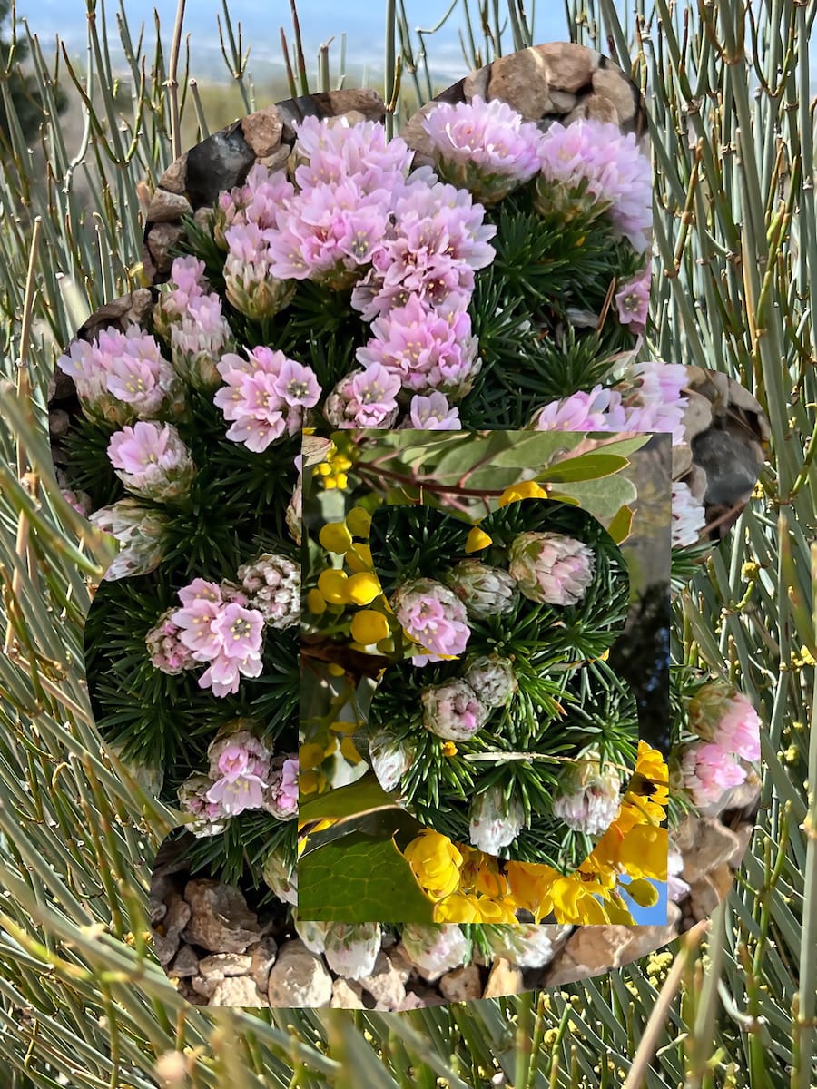 On the second floor of the space, Lindley tends to an individually actionable corner of the climate crisis in her poignant series Future Gardens (2022). A resident of Salt Lake City, the artist studied native plants that might sustainably replace the drought-ridden city’s impeccably manicured lawns. She depicts these water-conserving flora (along with similar foliage from elsewhere) in watercolor paintings, digital collages, and an immersive video installation.