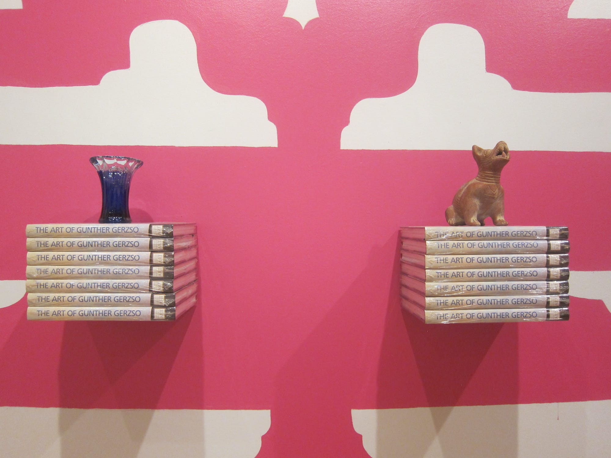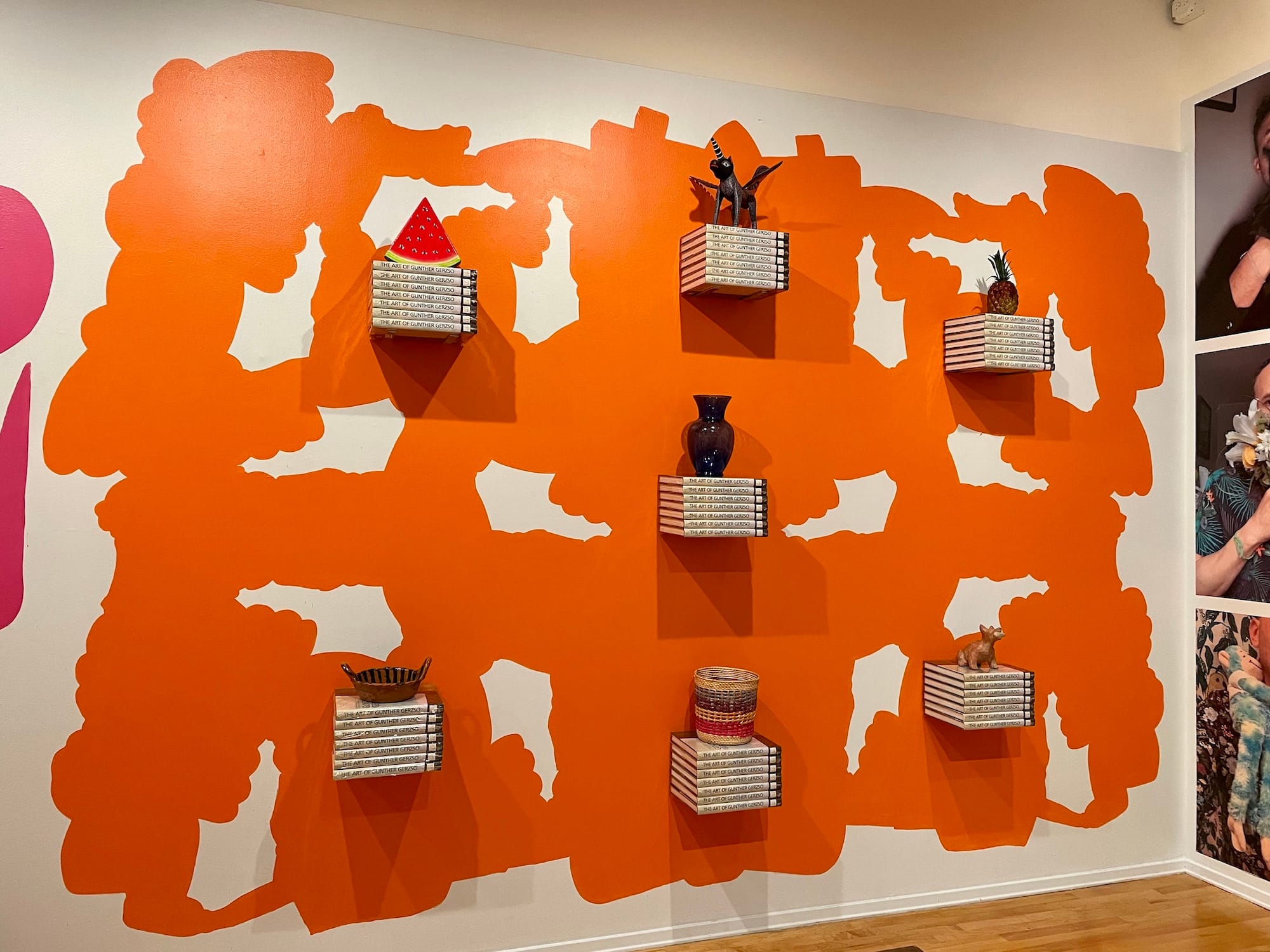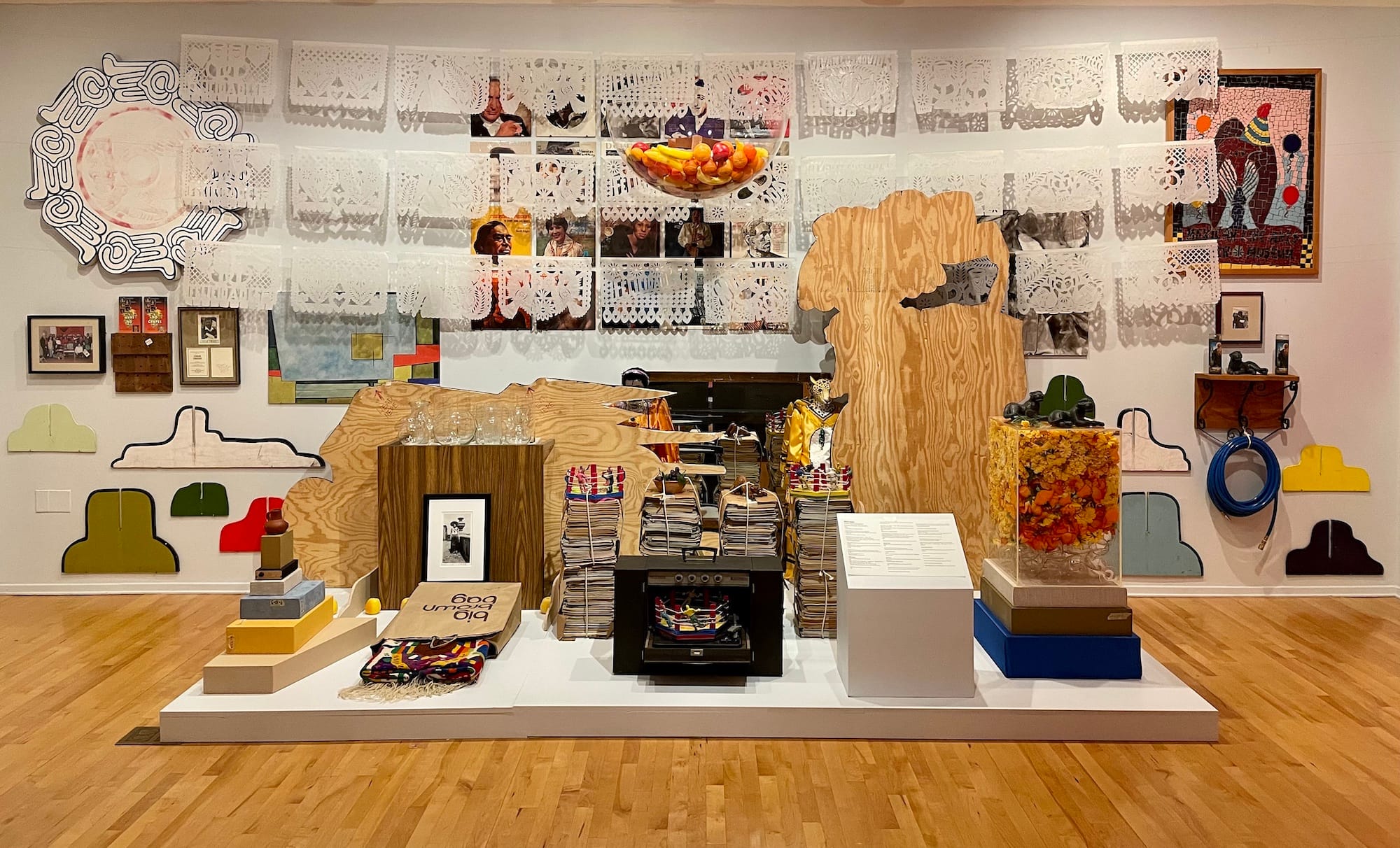 The remainder of Yo Soy Museo is concerned with the kind of materials that a feisty archivist might unearth in the far corners of an institution that, while housing a significant permanent collection of Mexican art from both sides of the border, has remained deeply committed to the local community that founded it in 1987. What’s an artifact, what’s an artwork, what’s a prop, what’s decoration, what’s disposable — these are slippery questions at the NMMA, and ones that Aguilar has taken up with great enthusiasm and delightfully unforeseeable results, including floating shelves built from overstock Gunther Gerzso catalogues and a pair of zippy murals whose colors and shapes derive from leftover Día de Muertos paint and props. The museum is beloved for its annual Day of the Dead exhibit, which features ofrendas newly commissioned each year from contemporary artists. Plus, you can get sugar skulls decorated with the names of dearly departed loved ones.
