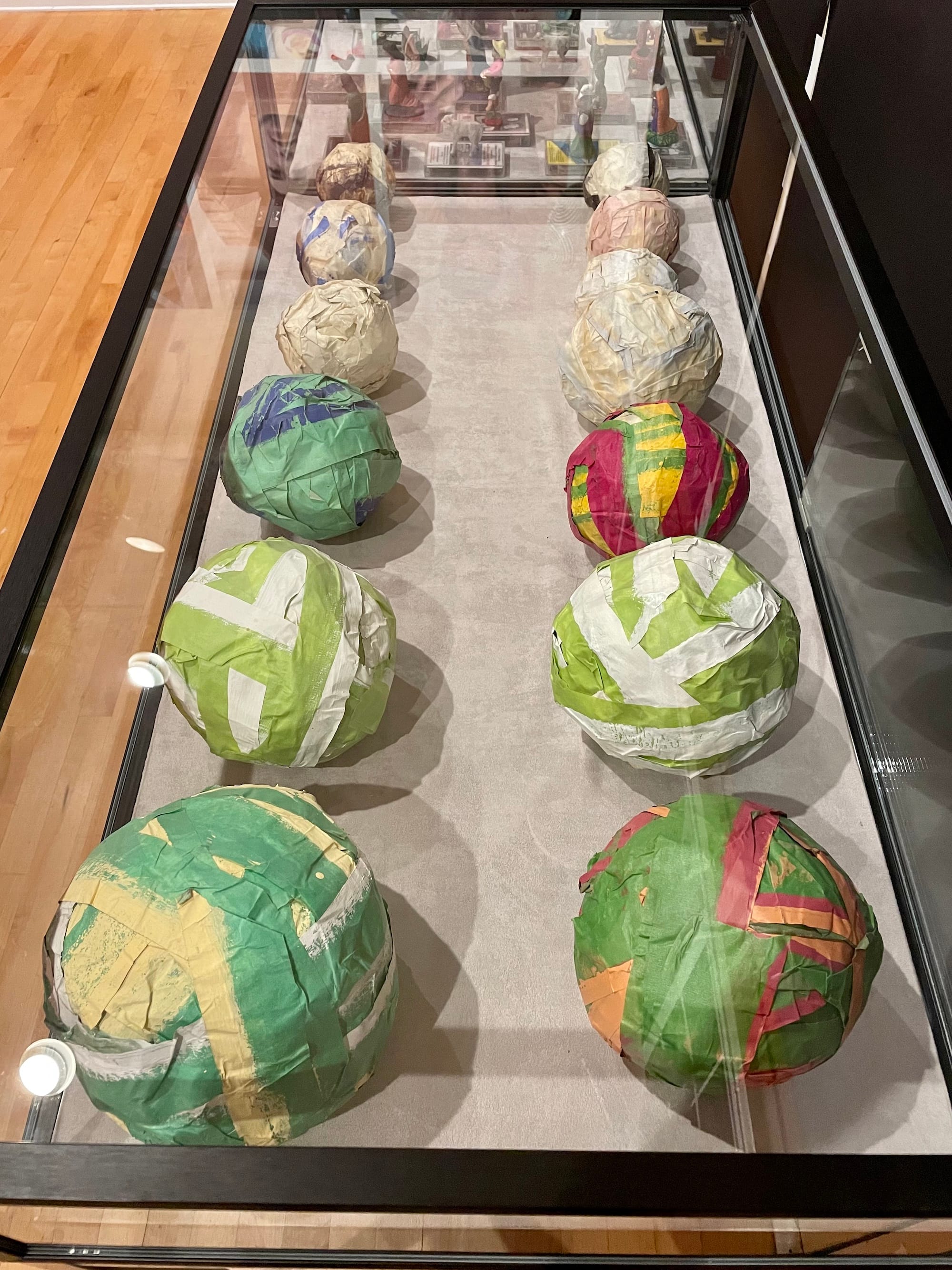 One of the very few items in Yo Soy Museo that has not been obviously subjected to Aguilar’s exuberant interpretation is a set of 13 balls made from paint and masking tape. These are the work of Luis Martín Gamez, or rather, they are the remains of his work: Gamez is a facilities associate at the NMMA and has been the in-house gallery painter for years. The balls are presented with reverence in a vitrine and ordered by size, the exception that proves the rule: anything can also, always, be an artwork. It’s not so far a stretch to go from there to the title of this exhibition. Yo Soy Museo, put another way, means anyone can be a museum.